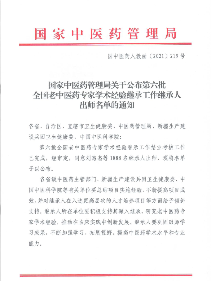 经过三年建设期,我院于今年7月,接受了第六批全国老中医药专家学术经验继承管理工作结业考核组专家的验收。经上级审定,根据国中医药人教函【2021】219号文件《国家中医药管理局关于公布第六批全国老中医药专家学术经验继承工作继承人出师名单的通知》公布,我院四名第六批全国老中医药专家学术经验继承工作继承人出师验收合格。