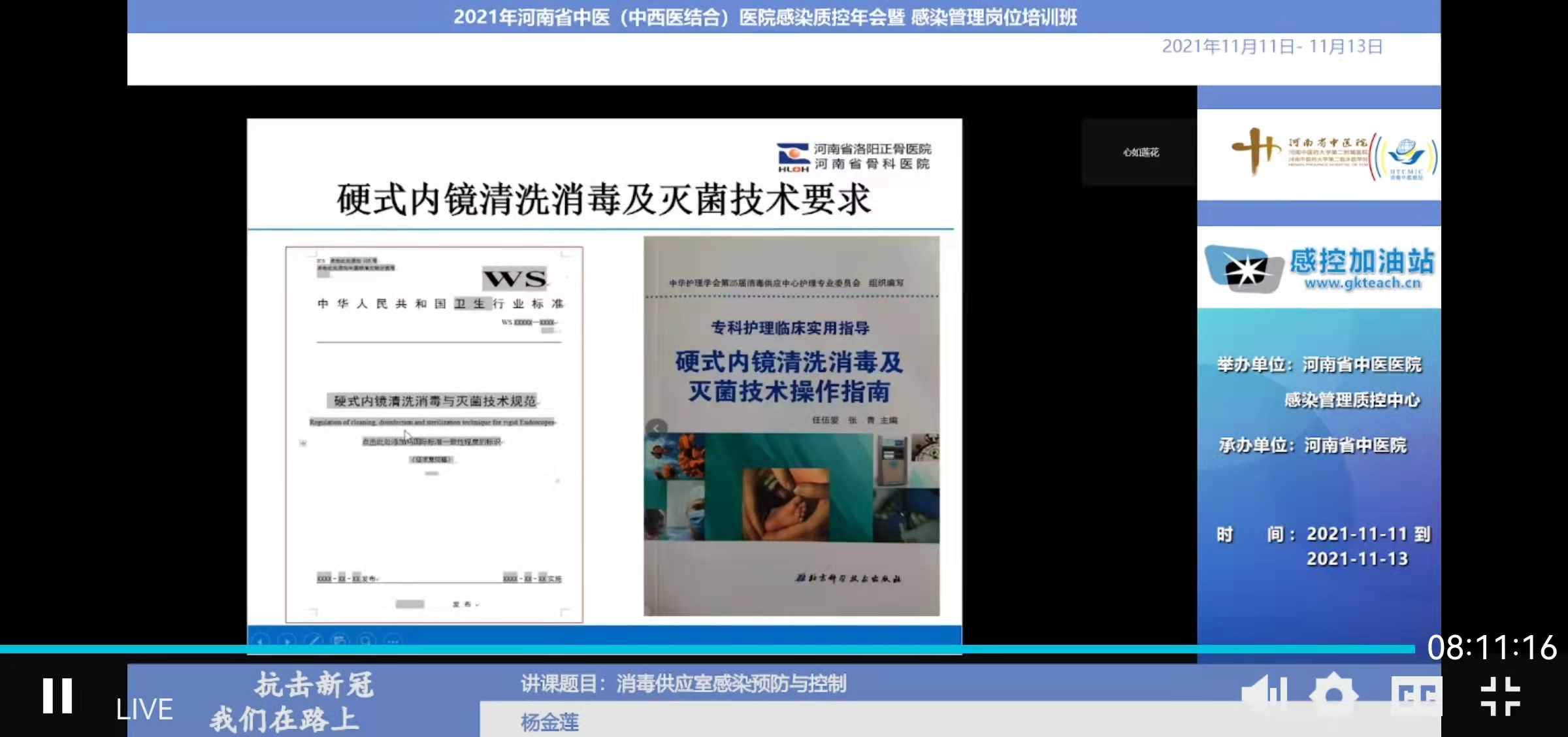 11月11—13日,由河南省中医院主办、河南省中医(中西医结合)院感质控中心线上举办“2021年河南省中医(中西医结合)医院感染质控年会暨感染管理岗位培训班”。我院感染管理科主任杨金莲应邀进行了《硬式内镜的清洗消毒灭菌管理》的专题培训。