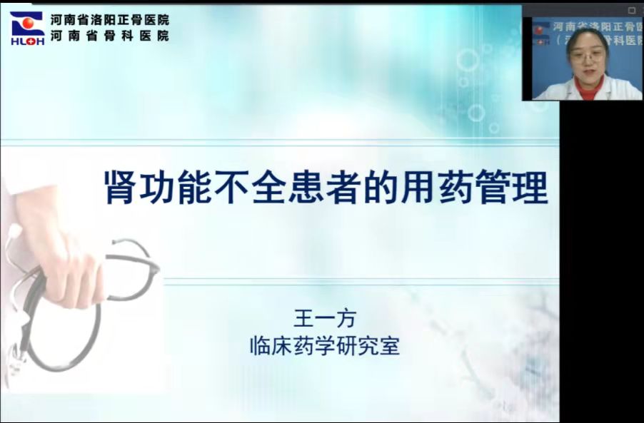 11月17日下午四点,正骨讲堂第141期暨“临床药师和您一起探讨合理用药”第二十四期钉钉线上直播开讲。本期讲堂特邀请我院临床药学研究室主管药师王一方为大家分享《肾功能不全患者的用药管理》。