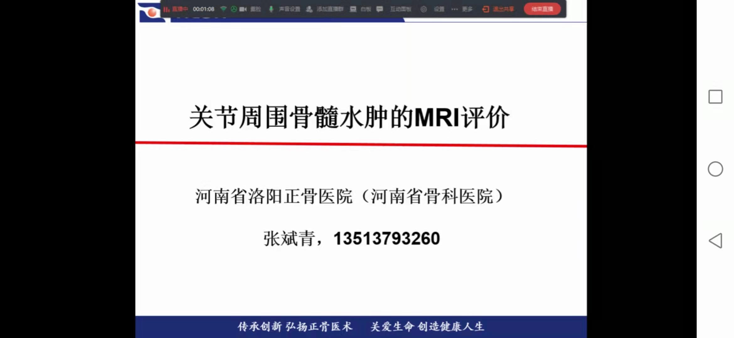 12月1日下午四点,正骨讲堂第142期钉钉线上直播开讲,并通过微信视频号同步直播。本期讲堂特邀请我院放射科副主任张斌青为大家分享《关节周围骨髓水肿的MRI评价》。