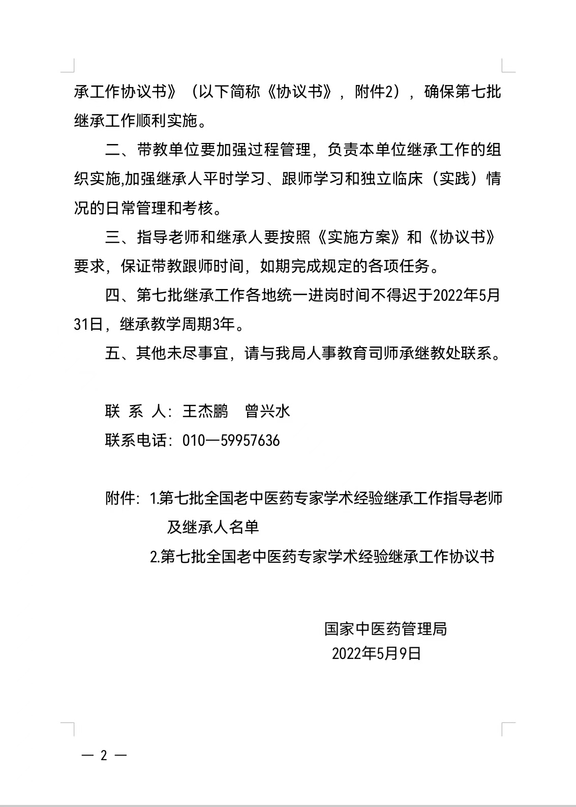 2022年5月9日,国家中医药管理局国中医药人教函【2022】76号文件,公布了第七批全国老中医药专家学术经验继承工作指导老师和继承人名单。
