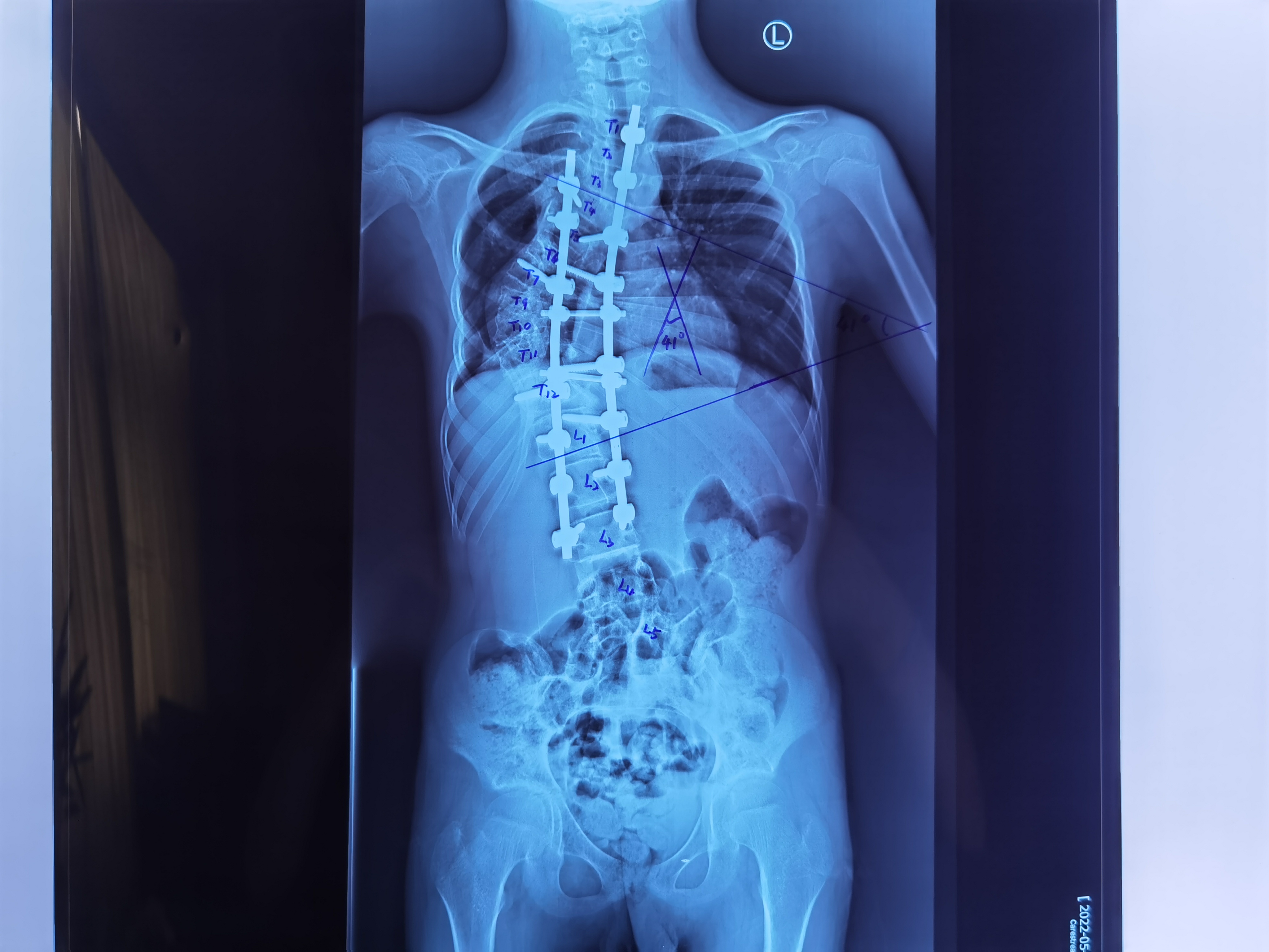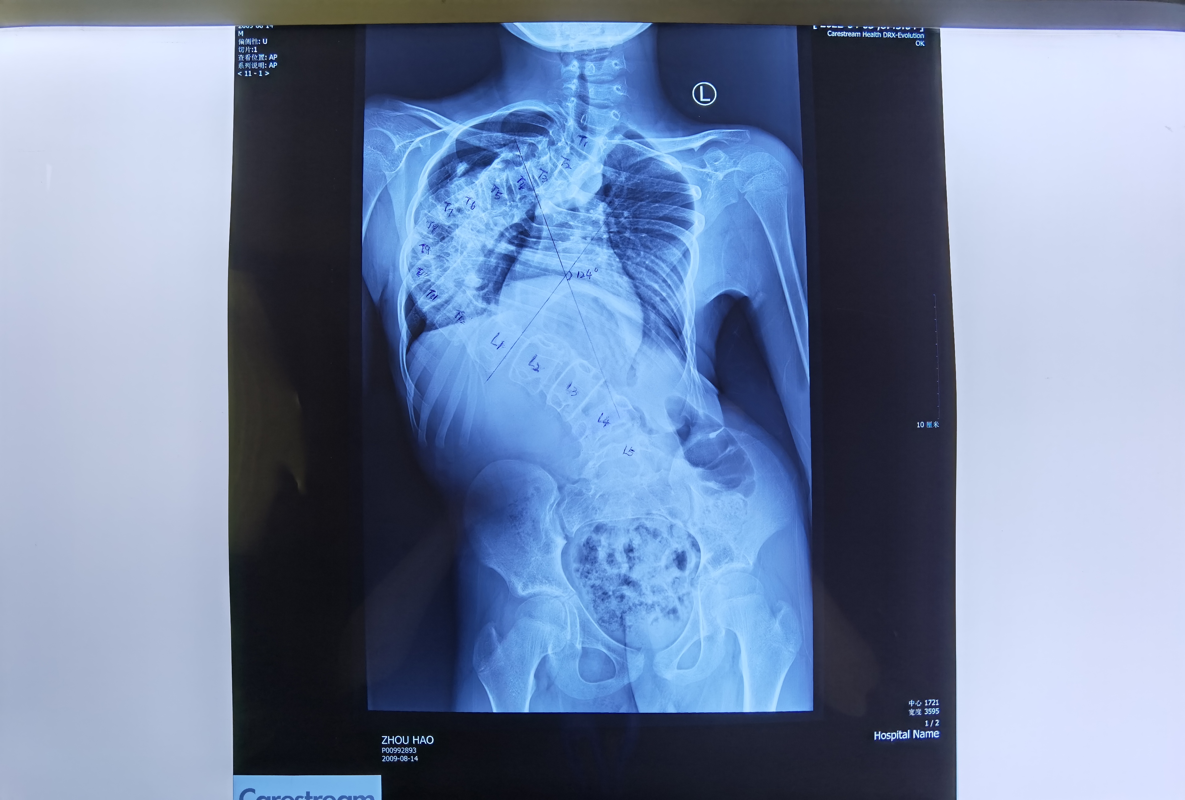 “通过术前术后的X光片对比可以看出,手术非常成功。”陈主任说。术前X光片显示脊柱以胸椎为中心向右侧呈明显侧弯畸形,侧弯角度COBB’S角为124度。右肩高,左肩低,骨盆倾斜,左侧骨盆高于右侧。术后X光片显示脊柱侧弯畸形得到明显的改善,脊柱侧弯角度COBB’S角为41度,较术前矫正了83 度,双肩部基本平齐,双侧骨盆基本平齐。