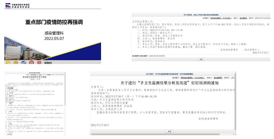为进一步提高疫情防控精准处置的有关能力,医院持续开展防控知识培训,在严格贯彻落实疫情防控规定的情况下,利用钉钉线上讲座、公众号知识科普、问卷星测试、线下讲堂等多种形式开展培训。自1月起,分别针对“核酸检测技能”、“疫情防控要求”、“传染病管理”、“环境清洁及消杀”、““医务人员执业暴露预防与处置”、“手卫生监测结果分析及改进”等共计开展了11次相关培训,并每日对新冠肺炎疫情最新状态定时进行通报与提醒。真正做到“人、物、环境三链同防”,不断巩固拓展医院疫情防控阶段性成效。此外,还针对保洁、针对保洁、安保、运送、放射科、检验科、功能检查科等薄弱部门重点科室进行感控知识再培训。根据不同岗位防控要求、实例剖析等进行示范、演练及问题总结,进一步完善工作流程与应急预案,最大限度的为周边群众、就诊患陪、医务人员提供安全保障,切实提升医院工作人员的应急处突能力。