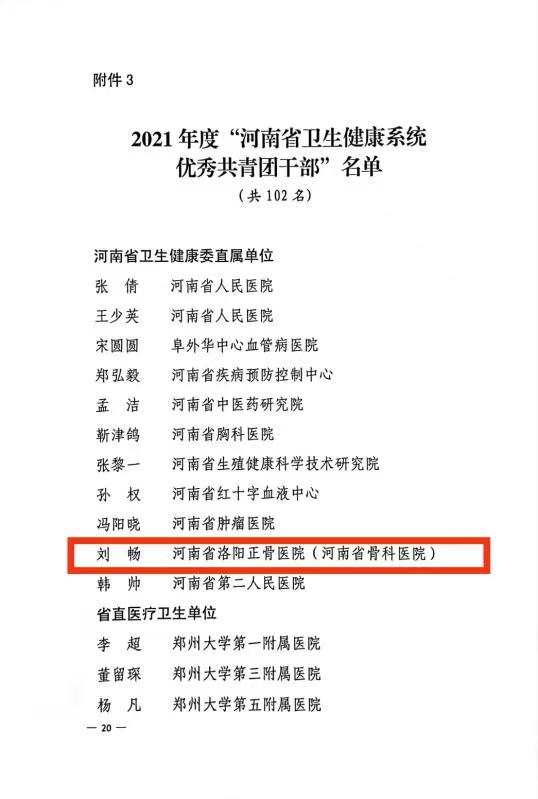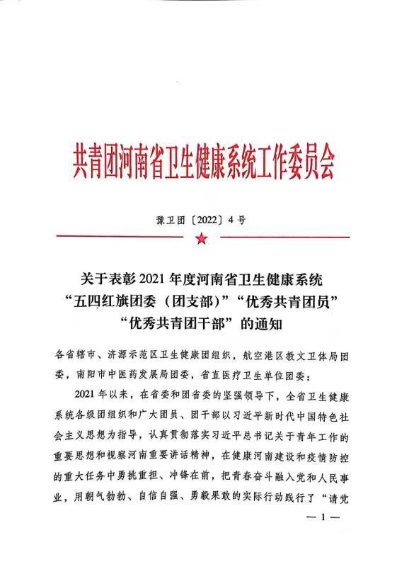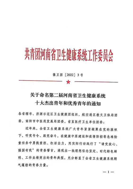 近日,河南省卫生健康系统发布《关于命名第二届河南省卫生健康系统十大杰出青年和优秀青年的通知》和《关于表彰2021年度河南省卫生健康系统“五四红旗团委(团支部)”“优秀共青团员”“优秀共青团干部”的通知》,我院岳辰博士和党委办公室刘畅同志分别被授予“优秀青年”和“优秀共青团干部”荣誉称号。