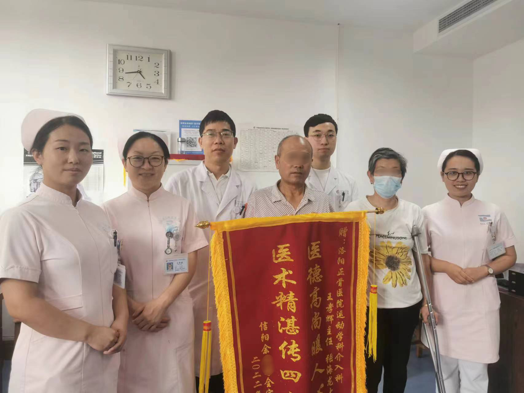 近日,余先生将一面写有“医德高尚暖人心,医术精湛传四方”的锦旗,送到我院运动关节镜二科医生办公室,向王孝辉主任、张海龙医生、万峰格护士长及全体医护人员表示感谢。