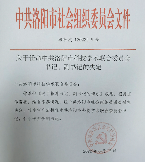 为切实加强党对社会组织的领导,促进社会组织健康发展,6月17日,经过民主推荐,组织考察,我院主任药师、硕士生导师、洛阳市药学会理事长何广宏被任命为洛阳市科技学术联合委员会书记。