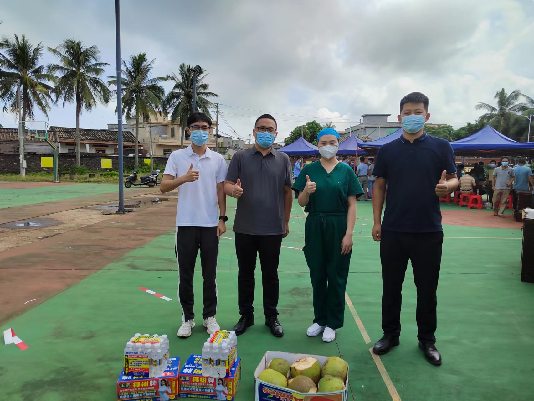 “你们辛苦了,看到我们河南老乡真的很亲切”来自河南建业集团的高经理说到,“这是一些椰子和水,感谢你们逆行而上,缓解海南的抗疫压力。”