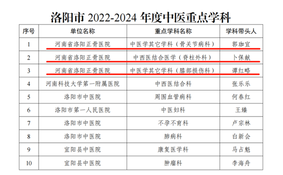 根据洛阳市卫生健康委员会《关于进行2022-2024年度洛阳市医学重点(培育)学科申报的通知》(洛卫科教〔2022〕2号)文件要求,按照积极推荐、合理布局的原则,经个人申请、资格审查、医院推荐、市卫生健康委组织答辩评审及公示程序,最终我院郭伽宜副院长团队申报的中医学其它学科(骨关节病科)、卜保献主任团队申报的中西医结合医学(脊柱外科)以及谭红略主任团队申报的中医学其他学科(膝部损伤科)3个学科被确定为洛阳市中医重点学科。