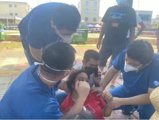 李志恒帮助患者清理口腔分泌物,以开放气道,同时拨120。大约5分钟后,患者嘴唇颜色恢复,考虑大概率癫痫发作,遂进行百会穴持续点按治疗,大约十分钟左右患者意识恢复。李志恒随即又把患者转运到阴凉地方。此时,我院王茜、刘文静及张腾飞等医疗队员也及时赶到,又现场为患者进行检查,双侧瞳孔正常,心率稍快,四肢活动正常。