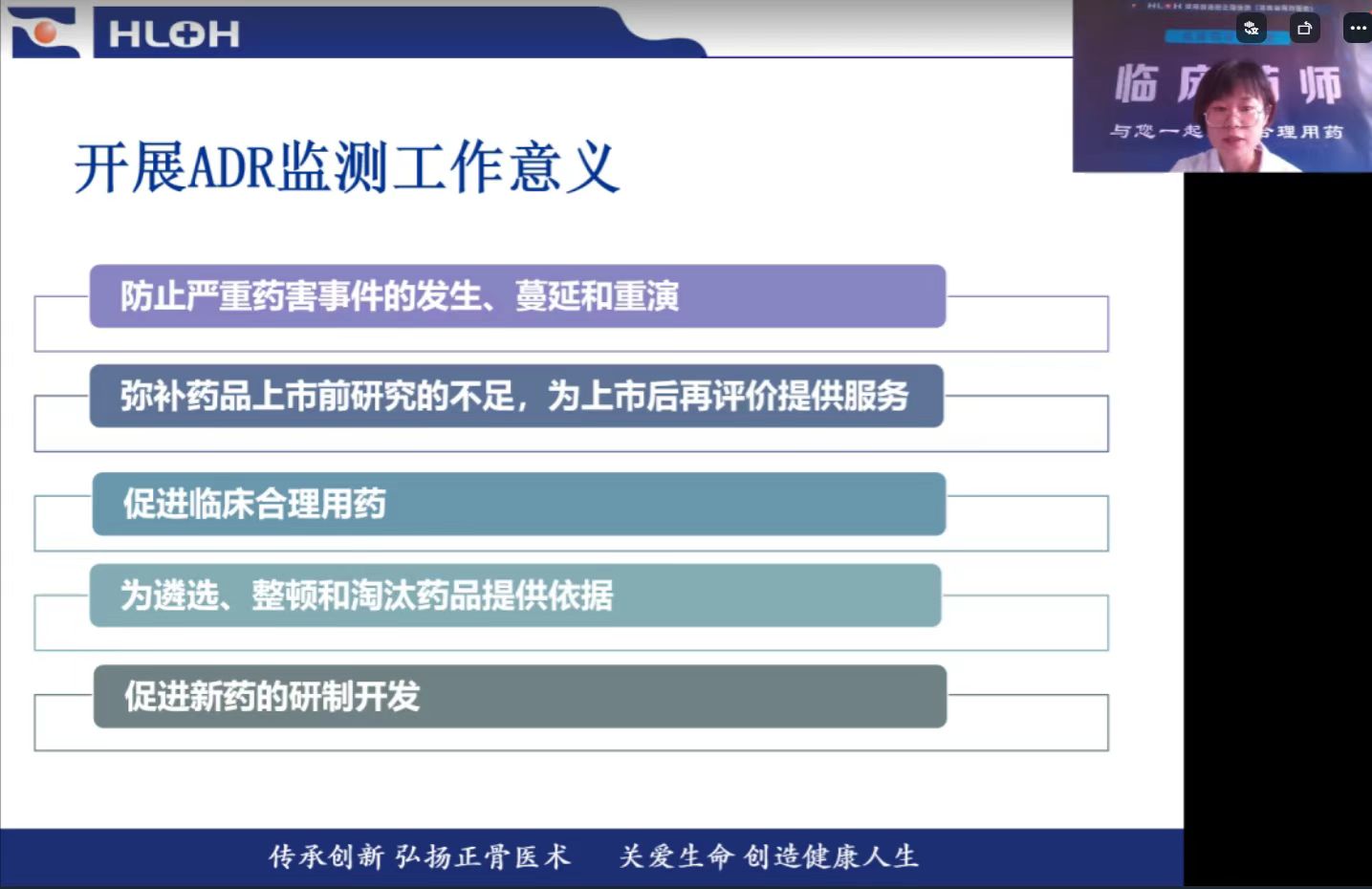 殷娜药师首先介绍了药品不良反应的基本概念、常见类型、发生原因、临床表现等,随后详细阐述了开展药品不良反应监测工作的必要性。最后殷娜药师逐步讲解了药品不良反应/事件报告表的填写,并建议临床医务人员加强药物安全性的监测,发现药品不良反应/事件后及时给予处理和上报。