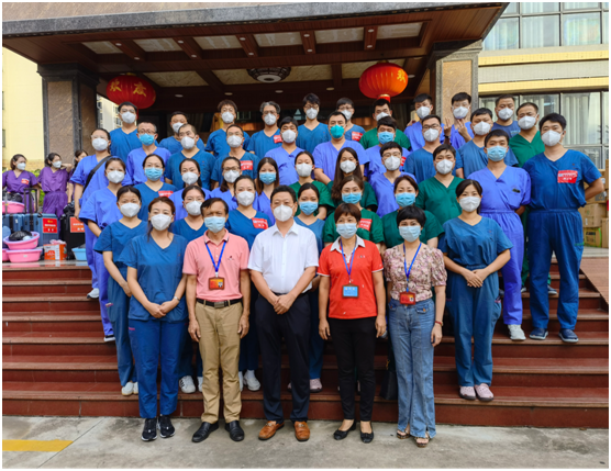 8月7日凌晨3点,我们到达了郑州院区,经过短暂休整,与郑州院区的20名兄弟姐妹汇合。看到医院为我们准备的几十箱抗疫物资,我深深感受到了医院对我们的关怀,正如伊院长在出征仪式上所讲:“无论你们在哪,医院永远是坚强的后盾,一定要做好防护,保证个人安全,平平安安归来便是最大的胜利,我等待你们凯旋。”听到院长铿锵有力的动员,我也暗下决心,一定不辱使命,出色完成任务!下午3点,我们40名队员便踏上征程,前往那没有硝烟的战场。