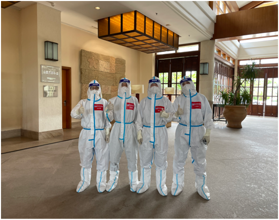 8月20日晚10点,接到上级通知,我们再次转战,凌晨2点到达了另一个隔离酒店。800余名密接人员在此集中隔离,虽然看到了心心念念的大海,却也感受到了任务的艰巨,喜悦与担忧相互交杂。当天晚上,11名隔离人员核酸结果阳性,须尽快转运至方舱医院,我和帅旗果断报名,承担起了阳性人员转运的任务。由于我们还没来得及熟悉酒店的防疫布局、转运流程及人员分配,执行任务效率低下,接触时间也较长。4个小时的转运,使我不断反思,如何才能加快转运速度,减少接触时间,最大限度保证安全。第二天,我再次穿着防护服熟悉三区两通道,熟悉酒店房间的分布,不断与酒店志愿者进行沟通,制定出了阳性人员转运流程图,并得到了大家的一致好评,而我也成为了阳性转运小组的组长,和帅旗、章甫、世雄三位兄弟24小时待命,随时奔赴一线执行阳性转运任务及新入隔离人员的核酸采样任务。每次执行任务前,我们的控感医生雷励飞老师都会反复交代,“你们四个的风险很高,要第一时间接收外来人员,又要送走阳性病例,一定要做好手卫生,做好防护。”虽然觉得有点唠叨,但我深深的感受到了领导对我们的关心!而我也深深的感受到了肩上的责任,一定要保证我们小组队员的安全。在我们的共同努力与高效配合下,共转运走三十余名阳性病例。