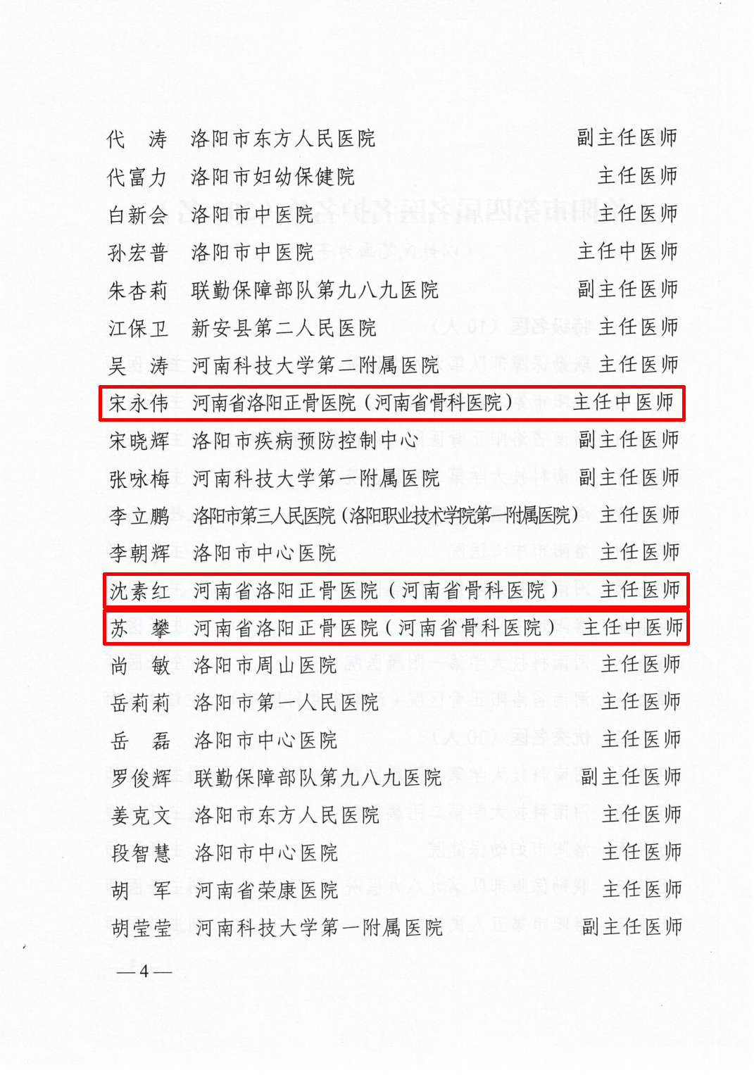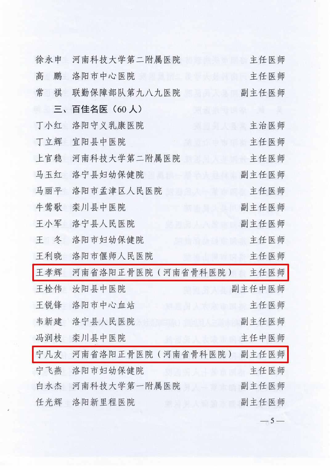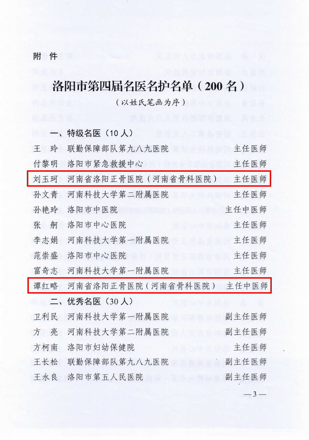 近日,洛阳市第四届名医名护评选结果揭晓,我院刘玉珂、谭红略入选“特级名医”;宋永伟、沈素红、苏攀入选“优秀名医”;王孝辉、宁凡友入选“百佳名医”;邢林波入选“特级名护”;司马海娟、杨玉霞、赵继红、程月起“优秀名护”;李志红、林继红入选“百佳名护”。