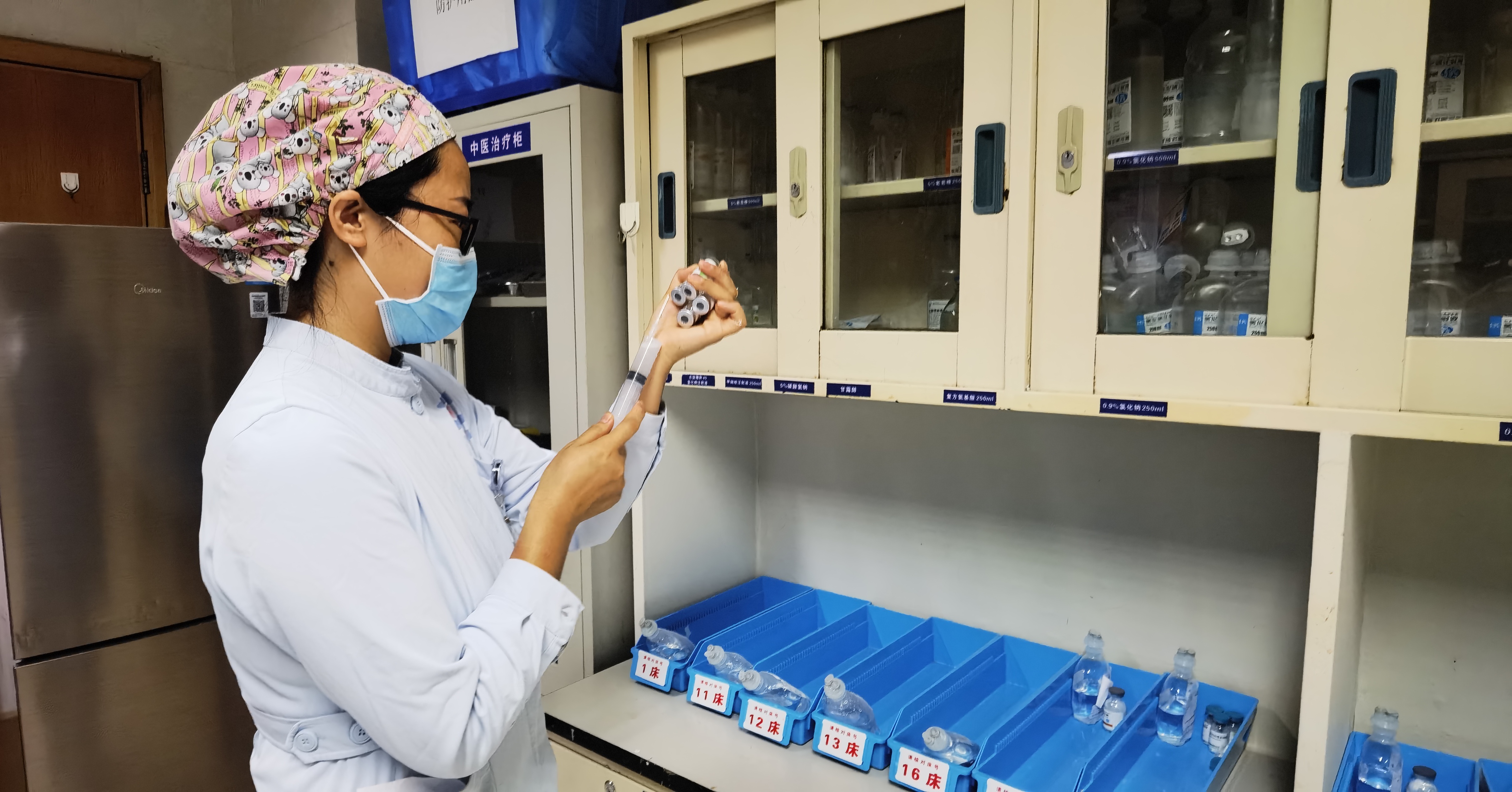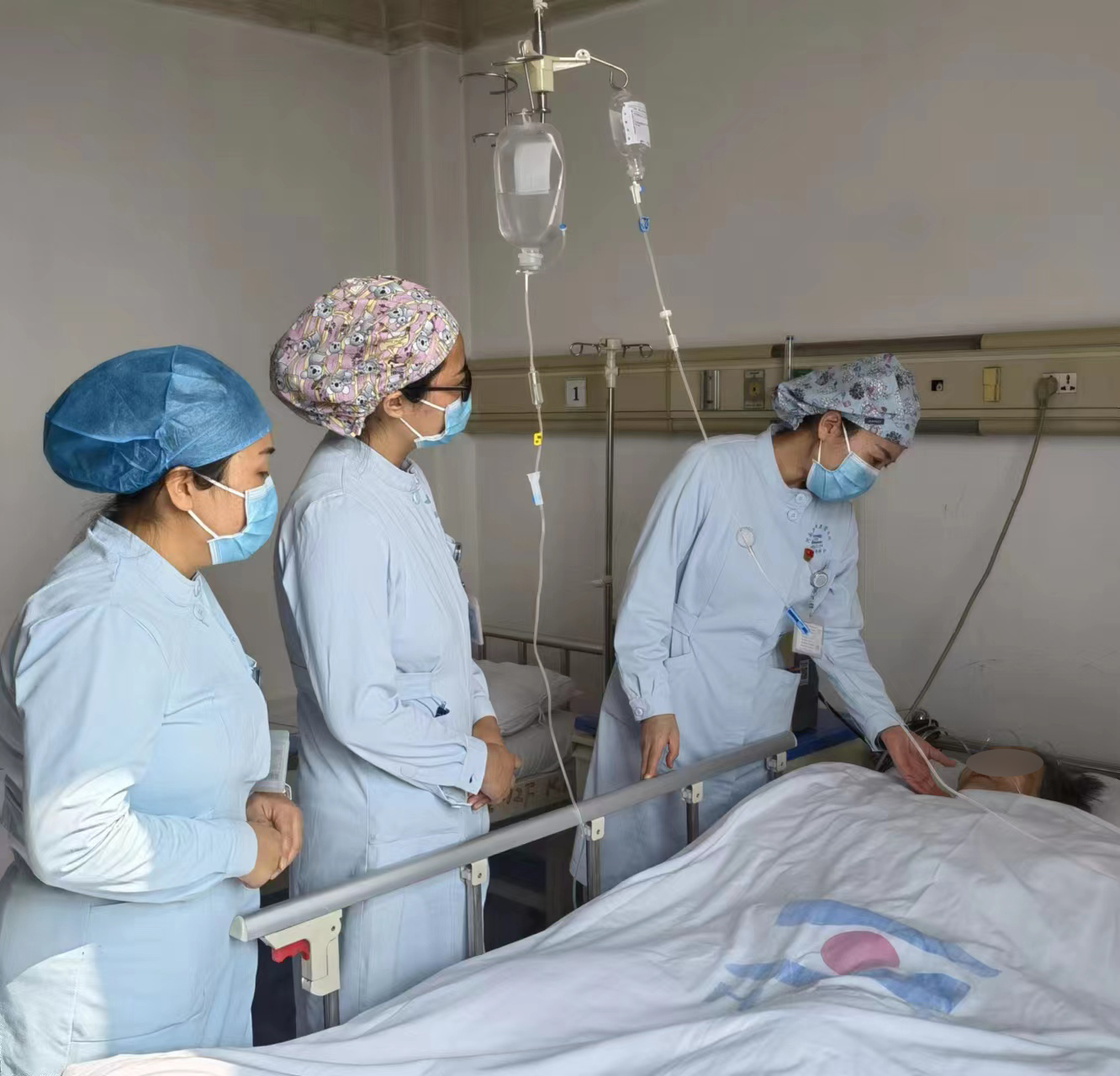 髋关节外一科留有30多名基础疾病较多的高龄患者,在进行值班人员安排时,髋一科七名护士主动要求留院值班。护士袁佳佳是两个孩子的母亲,老公在北京工作,大娃6岁,小娃4岁,只能依靠70高龄的公婆在家带娃,而她本人患有的颌面部三叉神经痛尚未痊愈,但她义无反顾克服家庭和个人的困难,选择在科室坚守;护士刘萌萌,近期身体不适,在吃中药调理,收到消息后主动报名,带着煎药罐回到科室和大家一同战斗,把四岁的幼子丢给家中老人;护士贾秀、张芮,她们的丈夫也封控在单位,年幼的孩子都是由家中老人照看……每次给孩子打电话的时候,年幼的孩子都不愿听妈妈们的电话,都说妈妈是个“骗子”,不爱她了,不管宝宝了。