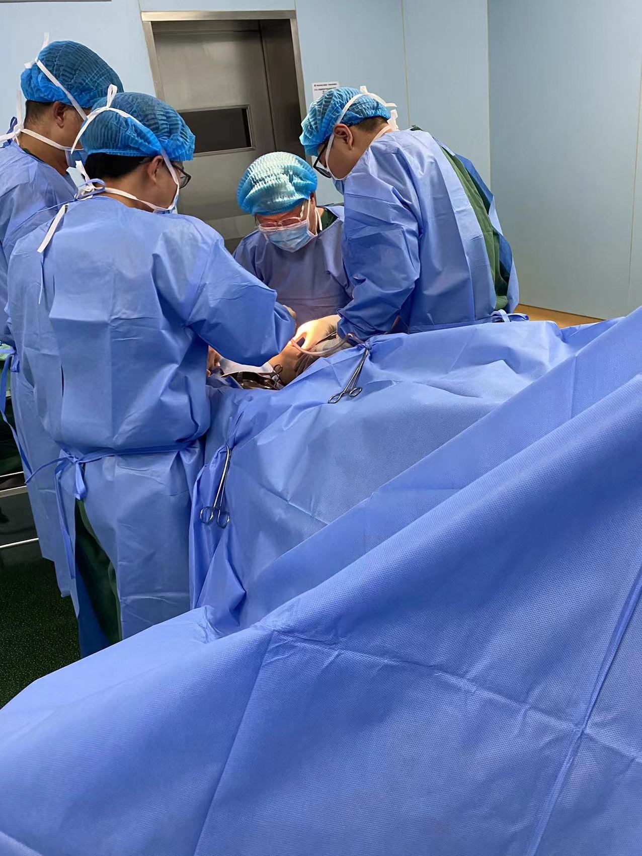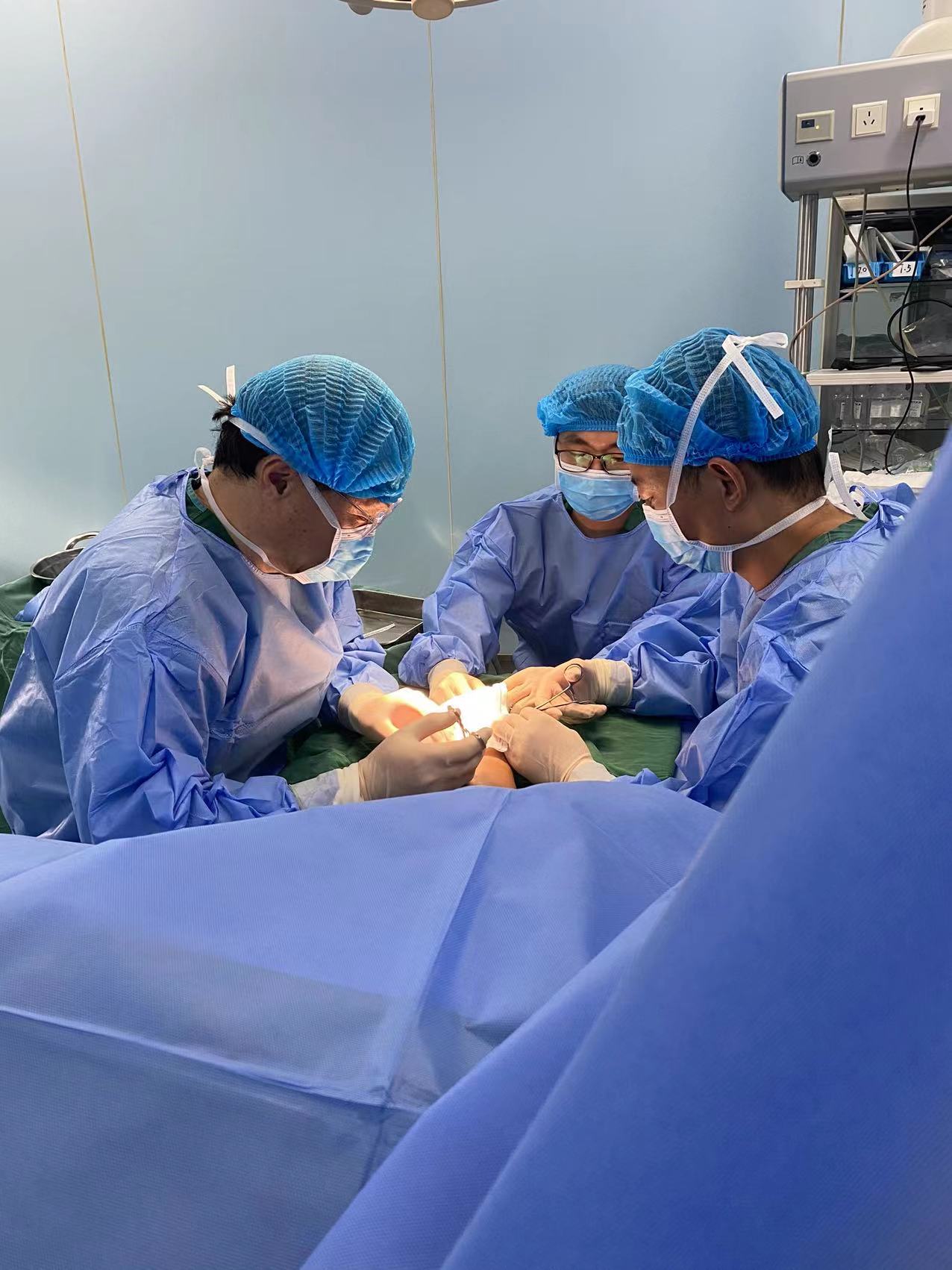 10月30日,和大家一样,手外显微骨二科主任吕松峰已经值守在科室十二天了。傍晚6点,电话响起,急诊科通知有急诊患者,吕松峰主任立即指派值班医生张清东前往会诊,同时自己立刻进行术前准备。这名患者在工作中不慎被电锯锯伤右小腿,诊断为小腿不完全离断。做好疫情防护术前准备后,在手术室麻醉医生梁秋霞和护士田燃的全力配合下,吕松峰主任带领大家经过三个小时的努力,顺利给患者固定了骨折,吻合了血管和神经,修复了肌腱和皮肤组织,手术紧张有序进入了尾声。