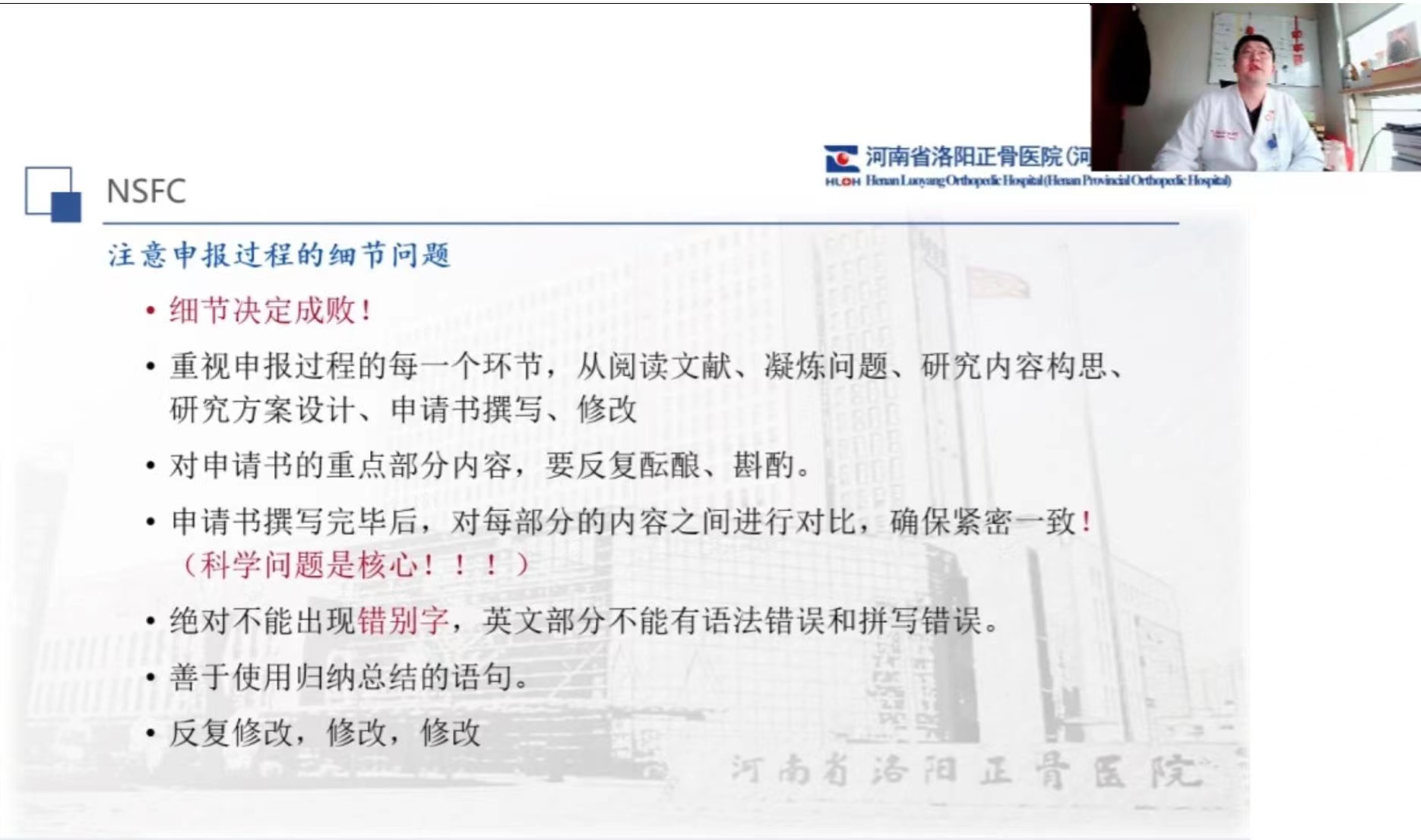 本次直播讲座为医院人员详细讲解了国自然基金申报的相关内容,讲座内容丰富、实用性强,有助于解决大家国自然课题申报中的困惑,对其他项目的申报以及如何更好的进行科研工作也有很好的指导作用。