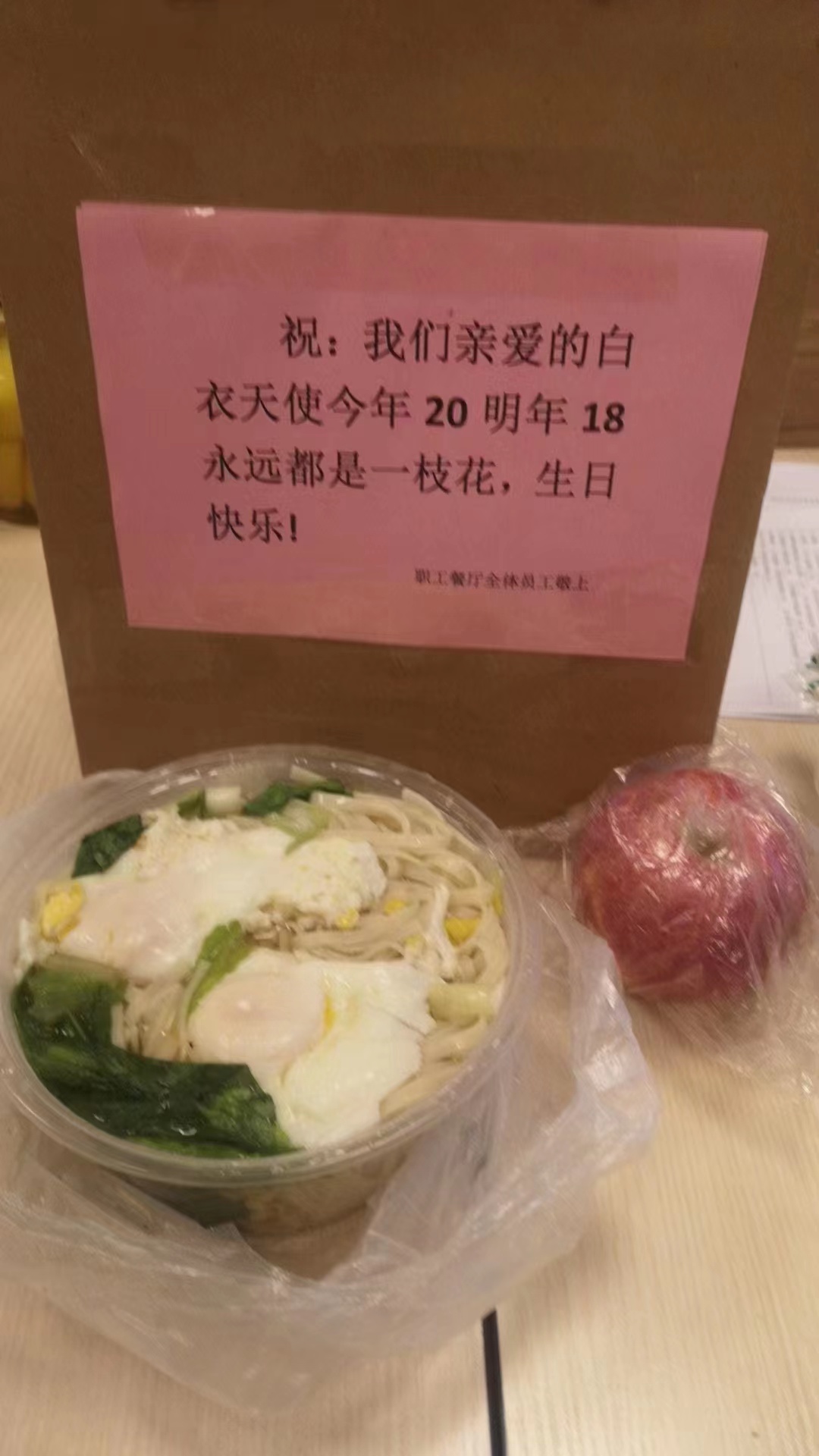 11月3日晚,康复院区的汪洋收到了一份惊喜:香香的长寿面、甜甜的苹果和暖暖的祝福。原来在前几日,汪洋无意间和职工餐厅的经理
