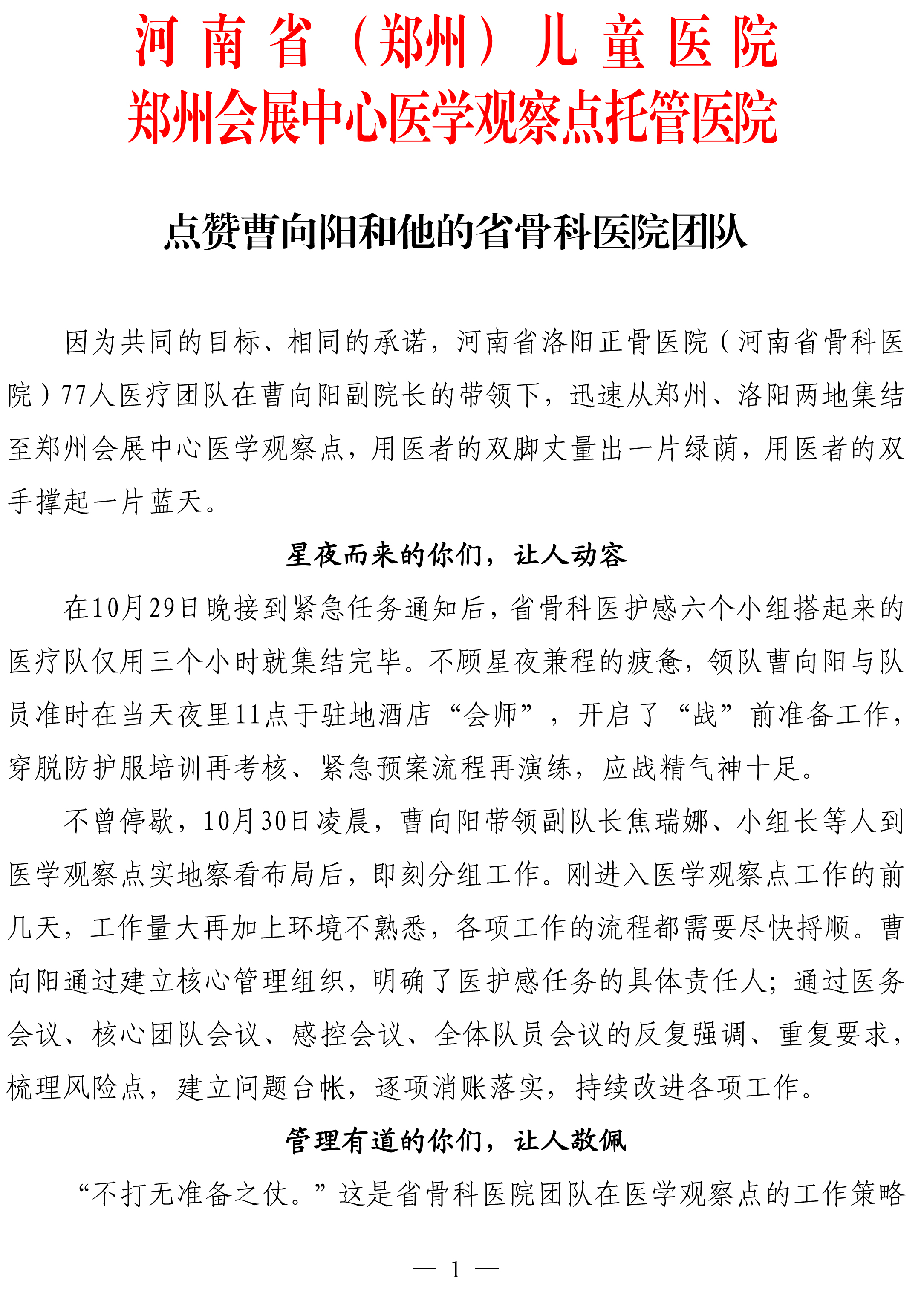 近日,由我院副院长曹向阳带领,在郑州会展中心医学观察点工作的医疗队收到观察点托管医院感谢信。