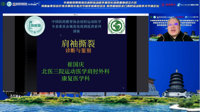 本次会议邀请了众多省外的肩肘运动医学大咖进行线上专题讲座,北京大学第三医院崔国庆教授就《肩袖撕裂诊断与鉴别》进行了演讲,上海瑞金医院王蕾教授分享了《反式肩关节设计与临床应用》,北京积水潭医院鲁谊教授分享了《肘关节骨关节炎的诊治》,西安红会医院康汇教授分享了《肩袖分层损伤的评估与处理》,北京大学人民医院的陈建海教授阐述了《肩袖撕裂的评估》,解放军总医院的张强教授分享了《三维超声在肩袖撕裂形态学评价中的临床价值》,临沂市中医院许波教授分享了《如何开展培训基地的工作》。