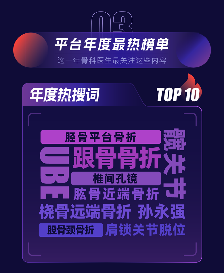 近日,唯医骨科发布2022年度报告,总结了该平台2022年总体数据、资源及用户等情况。其中,“平台年度最热榜单—年度热搜词”中,我院郑州院区首席专家孙永强教授入选榜单前十。
