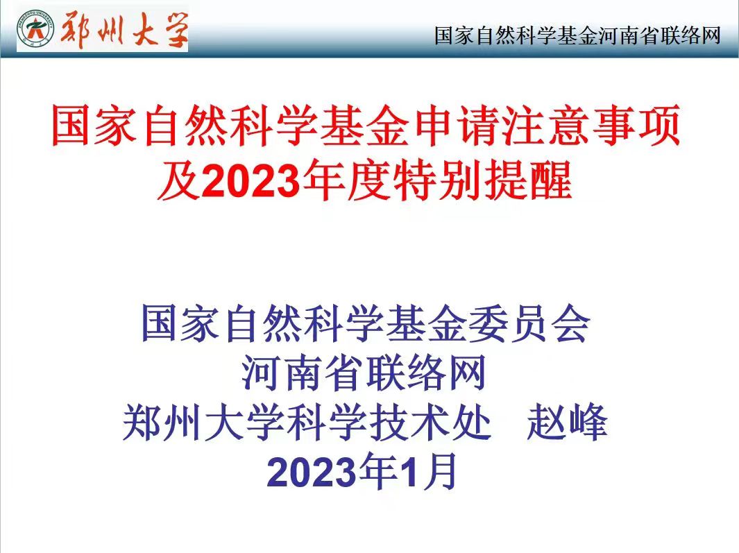 赵峰教授,郑州大学科学技术处处长,从事基金工作已达18年之久,多次荣获国家自然科学委员会先进工作者称号,熟悉基金委的管理流程,了解申请书的撰写技巧,曾受邀在全省高校科研工作管理会及省内外多家高校、科研机构做有关基金工作的报告。本次讲座,赵峰教授首先从国家自然科学基金相关申请注意事项进行详尽的阐述,包括申请人身份要求、限项申请规定及申请人和参与人其他注意事项等。然后,赵峰教授结合2023年申请的最新通知,总结了今年申请时的特别提醒事项。最后,对大家提出的问题做了详尽的回答。