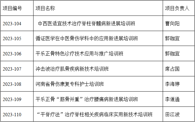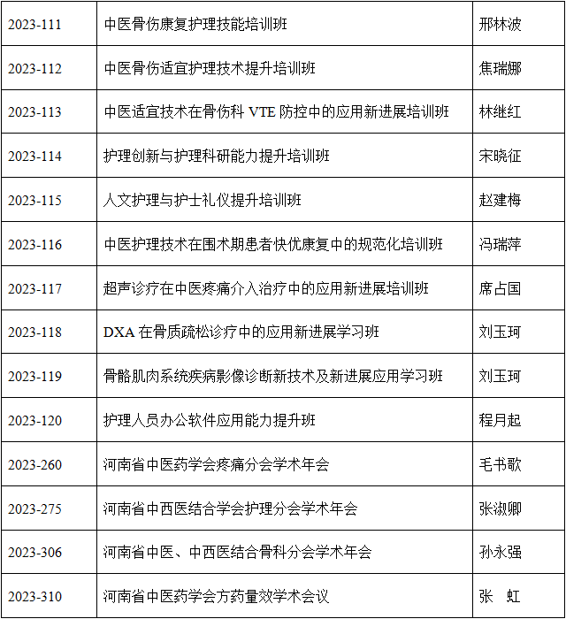根据《河南省卫生健康委关于开展河南省中医药继续教育项目2022年度总结和2023年度申报工作的通知》和《河南省卫生健康委关于公布2023年度河南省中医药继续教育项目名单的通知》(豫卫中医函〔2023〕8号)文件,经个人申报、医院审核推荐、省中医药学会组织专家评审及省卫健委审定,最终我院入选21个河南省中医药继续教育项目。