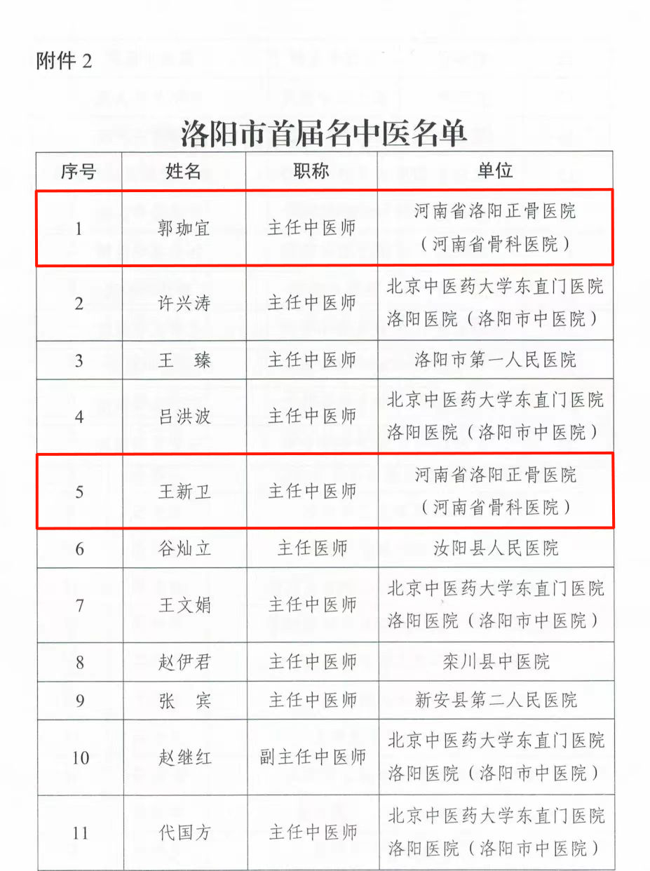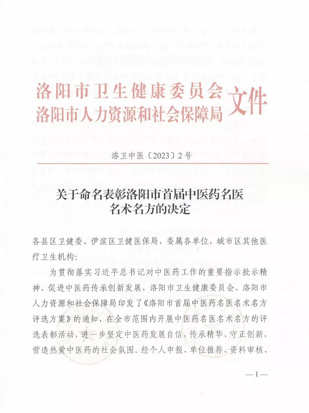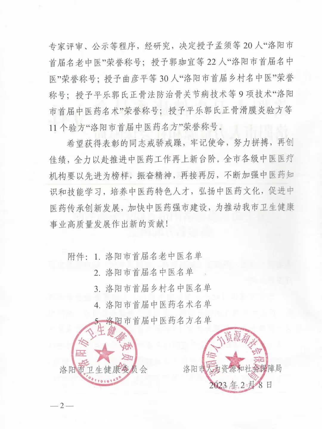 经个人申报、单位推荐、资料审核、专家评审、公示等程序,授予我院郭珈宜、王新卫“洛阳市首届名中医”荣誉称号;