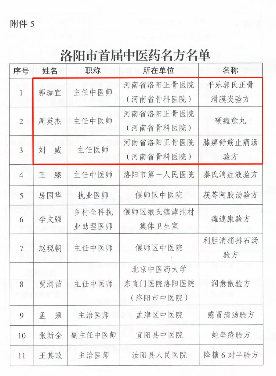 授予郭珈宜——平乐郭氏正骨滑膜炎验方;周英杰——硬瘫愈丸;刘威——膝痹舒筋止痛汤3个验方“洛阳市首届中医药名方”荣誉称号。