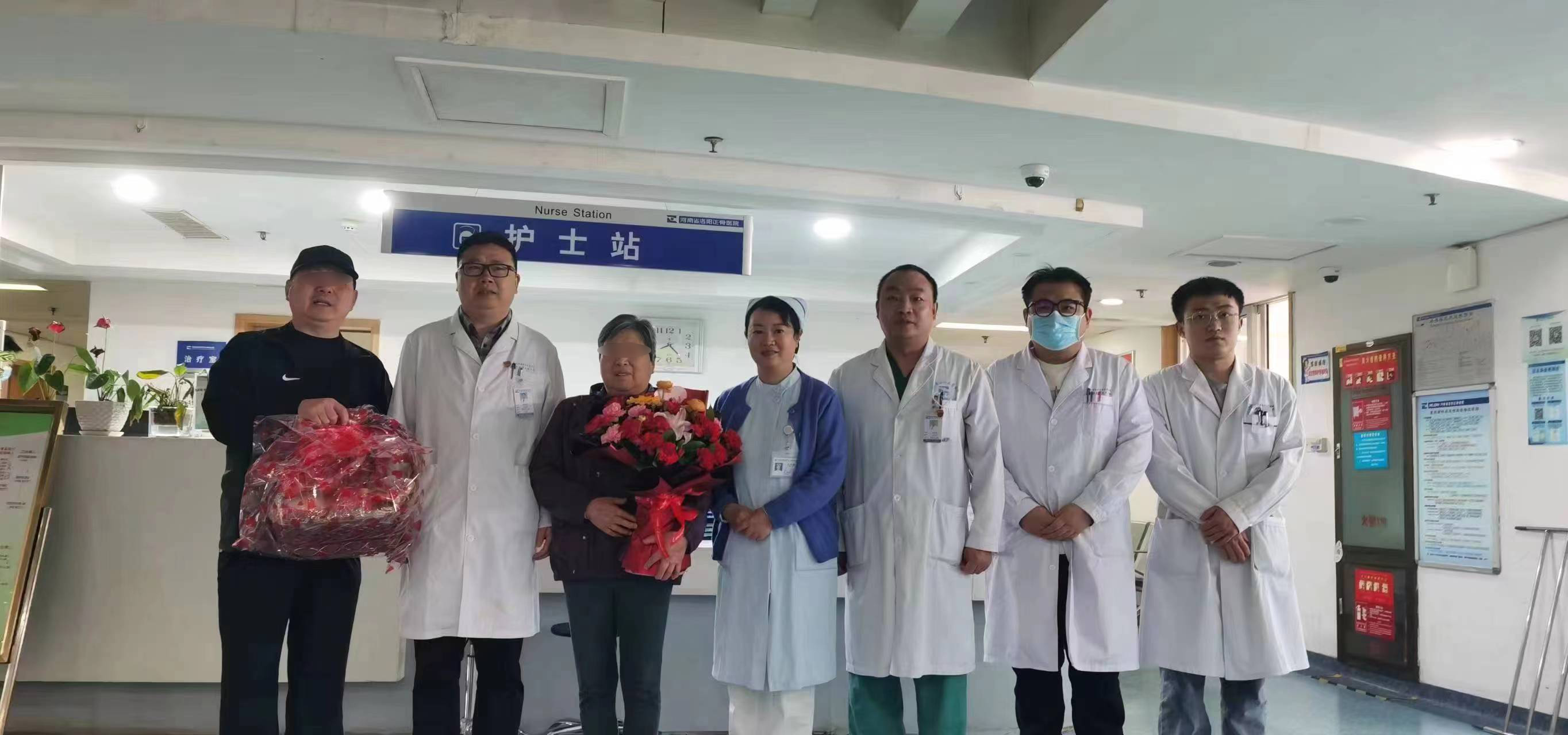 近日,脊柱外三科护士站前,史奶奶喜笑颜开地握着陈海龙主任的手,说道:“真是多亏了你们医生高超的医术,护士们的精心照料,我这疼了五年的老腰终于治好了!”说罢,史奶奶将手中的鲜花,献给了陈海龙主任、管床医生马俊杰及脊柱外三科的医护团队,并与大家合影留念。