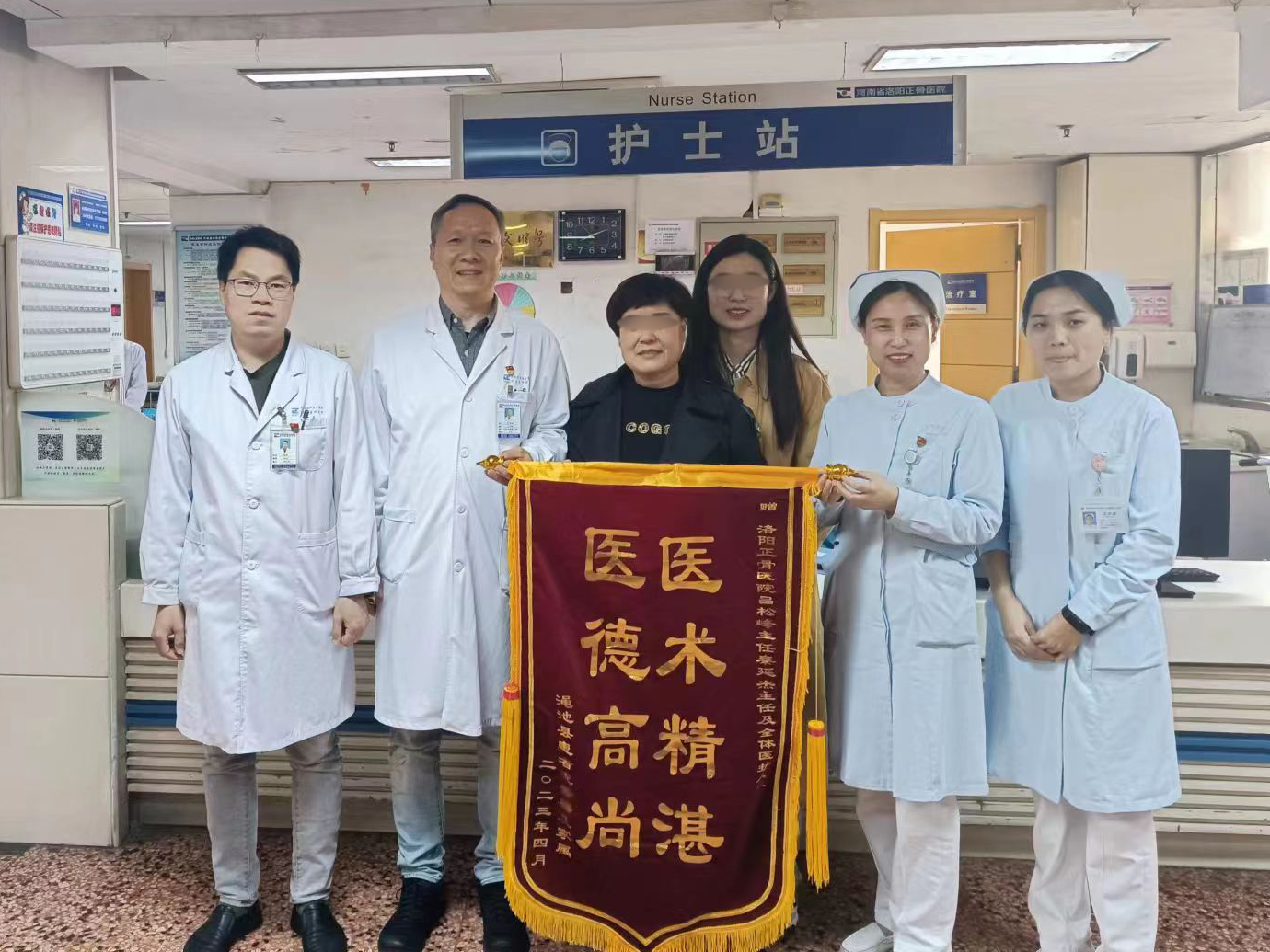 2023年4月10日,已经出院的庞女士及其家属,借来院复查的机会,将一面“医术精湛 医德高尚”的锦旗送到我院手外显微骨二科主任吕松峰的手中。庞女士激动地说:“感谢吕松峰主任、秦延杰医生和科室所有的医护人员,你们的精心治疗和护理保住了我的腿,我现在走路都正常了,外人根本看不出受伤过。我在这里保住了要截肢的腿啊!”