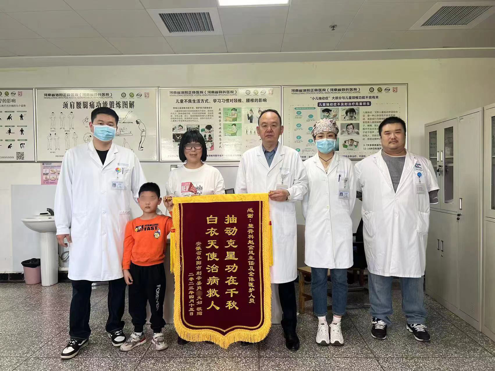 2023年4月15日刚上班,来自安徽省阜阳市利辛县的肖女士就带着孩子来到我院门诊中医整脊科副主任赵金风的办公室,送来锦旗表示感谢。