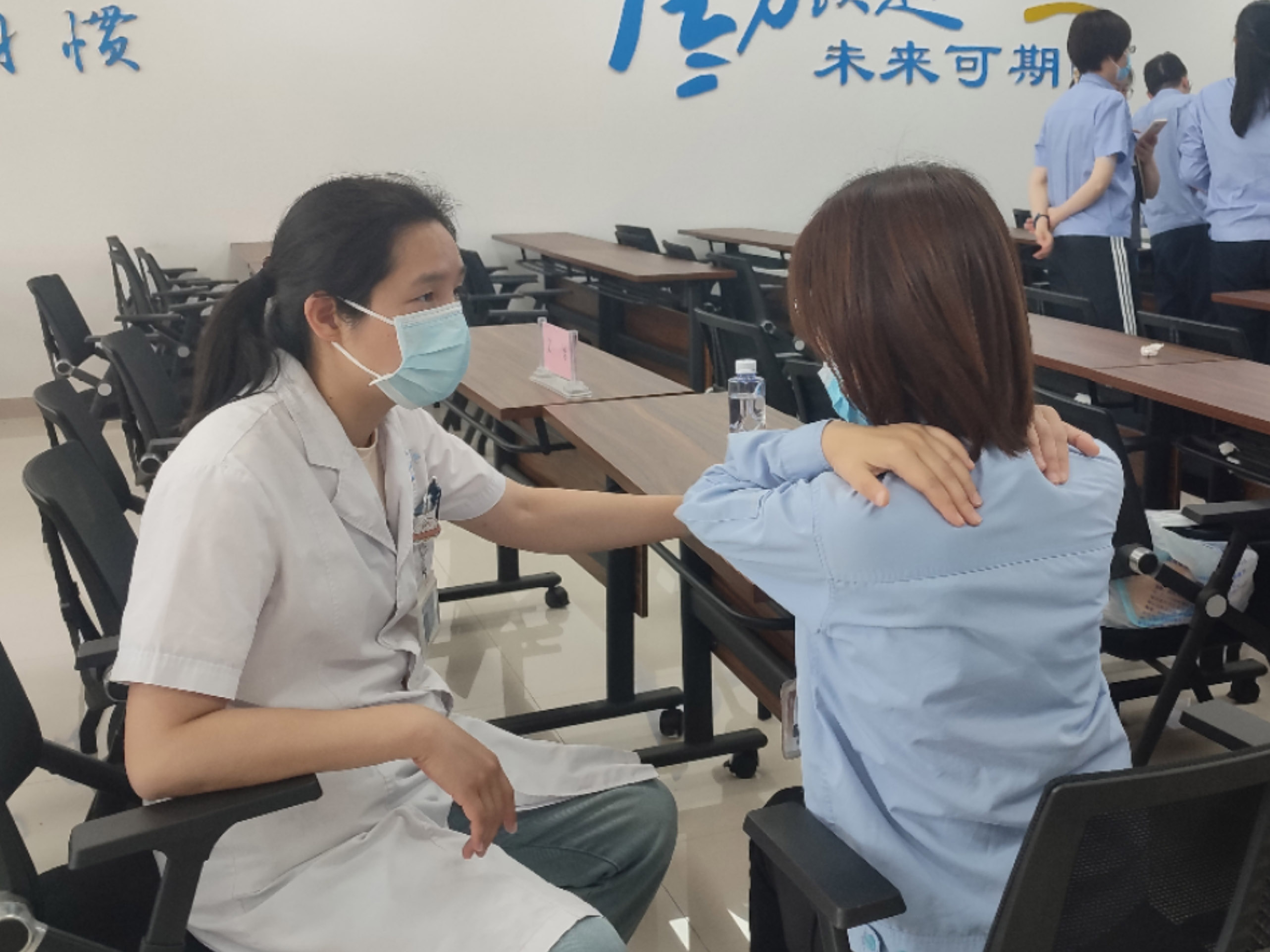 5月20日,由我院药学部组织,我院骨关节病一科主诊医师李峰、风湿病三科(骨质疏松科)主诊医师张万义、颈肩腰腿痛三科主诊医师张杰、骨关节病一科主治医师杨孟孟、膝关节外一科主管护师刘平等不畏天气炎热来到中航光电科技股份有限公司开展“健康洛阳行?大医献爱心”志愿服务专项行动。