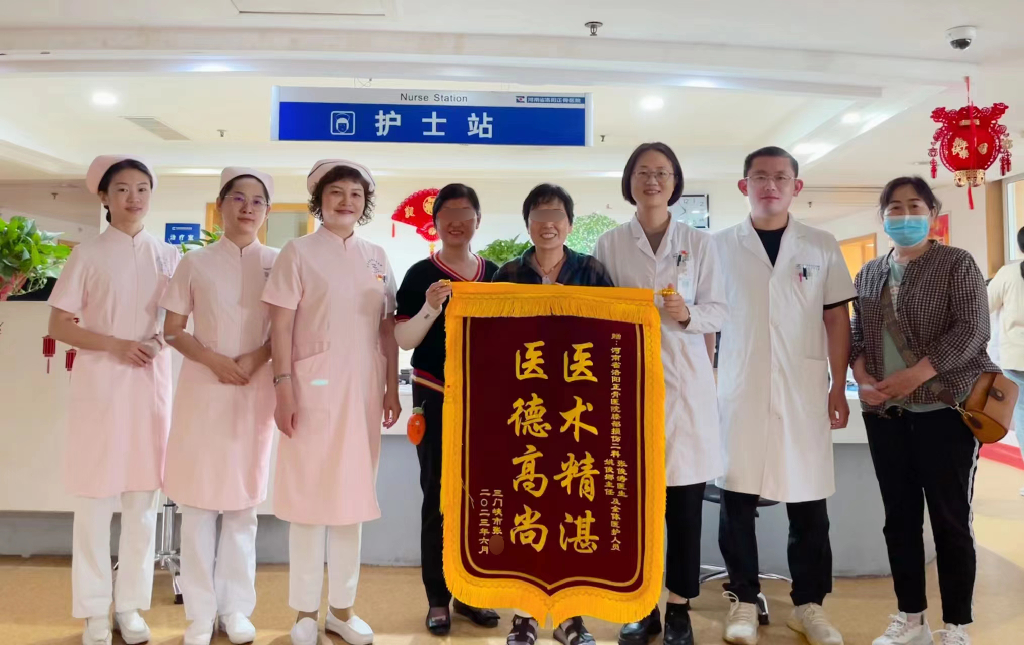 6月13日出院患者郭女士及家属将一面书有“医术精湛见奇效 医德高尚暖人心”锦旗送到膝关节外五科主任刘威、管床医生王红超;护士长邹吉锋、主管护士夏冰等医护人员手上,真诚地表达感激之情。