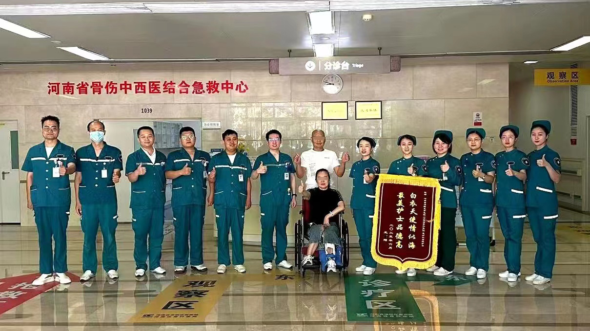 2023年4月19日,王女士因交通事故伤被我院郑州院区救护车接回,来院检查后诊断为左侧胫骨平台骨折伴腓骨骨折,柴巍浩医生与患者简单沟通后将其收治在急诊科病房进行治疗。治疗前期,王女士一直内心苦恼,担忧自己将来是否能够正常行走,医生们不厌其烦且周而复始的耐心指导下,王女士悬着的心才得以放下。护士们还为王女士进行定期的健康宣教和心理疏导,王女士焦虑、急躁的心也慢慢平复。经过早期及时治疗和后期的康复功能锻炼,王女士对预后非常满意,住院期间便多次写来感谢信,7月1日顺利出院。在临出院之际,王女士和家人又送来了一面锦旗,这是对医生精湛的医术、高尚的医德以及急诊科全体护理人员无微不至的关怀服务和照护的感激与肯定。