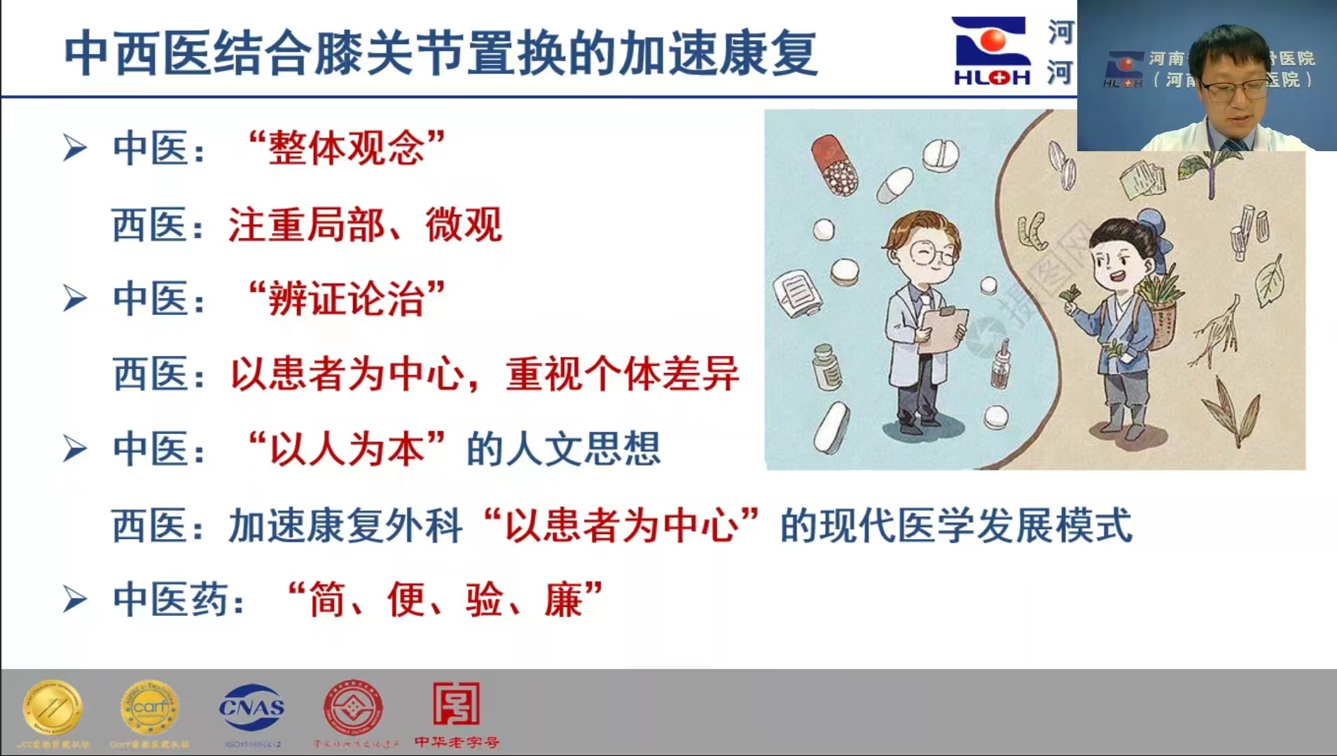 杨澜波博士以《中西医结合膝关节置换加速康复》为题,围绕加速康复外科起源与发展、加速康复外科在关节置换中的应用、中西医结合膝关节置换的加速康复三部分展开演讲。临床中,杨澜波博士始终坚持把加速康复的理念贯穿在术前、术中、术后各个环节,并延伸至出院后管理。术前通过情志疏导、血糖控制、体质辨识、戒烟戒酒、营养支持等为手术创造良好的条件;手术当日制定合适的饮食方案、液体管理、维持体温稳定、预防感染、微创操作理念进一步减轻了手术对患者造成的应激反应,为加速康复奠定基础;术后镇痛应用,预防低血压、深静脉血栓、肺部并发症等,结合睡眠管理、功能锻炼等,同时积极关注胃肠功能的恢复。所采取的系列措施细致恰当,环环相扣,推动康复加速。杨澜波博士总结说:中西医结合膝关节置换加速康复有望成为实现最佳疗效、最快康复的中国模式加速康复。