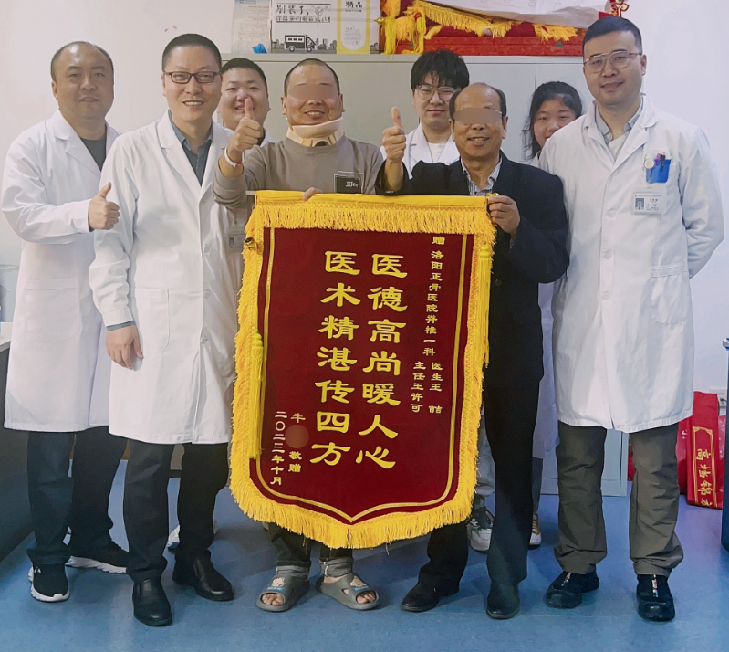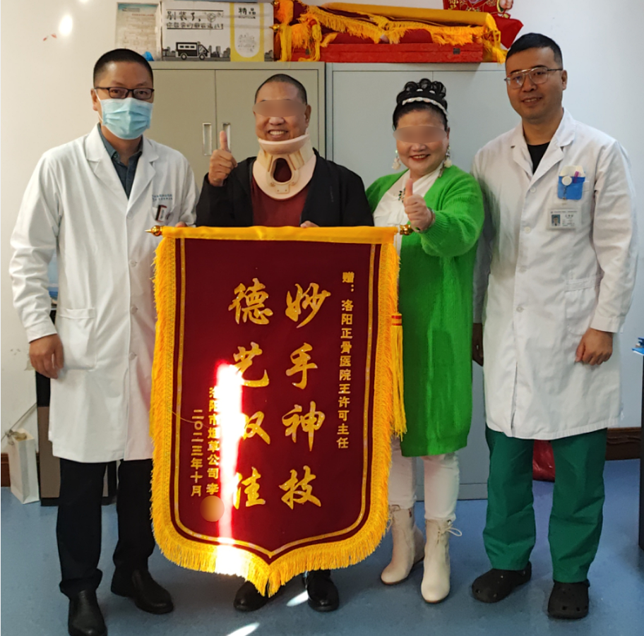 患者李先生,66岁,入院时自述颈部和左上肢疼痛和麻木已有15年,双腿无力,2月前加重。经过入院检查,诊断为脊髓型颈椎病,同时李先生自身还有高血压、冠心病等心脑血管疾病。李先生颈椎多节段狭窄且后纵韧带钙化,王许可主诊医师及科室王喆医生共同制定了详细的治疗方案,经过和患者的反复沟通,为患者进行了颈椎微创UBE手术治疗,避免了大开刀手术。凭借丰富的手术经验和娴熟的操作,王许可主诊医师与王喆医生仅用时1个小时便顺利完成手术,愈后效果远超李先生心理预期,之前的各种症状都得到明显缓解。李先生术后难掩激动,便赠锦旗对脊柱微创一科全体医护人员表示感谢。