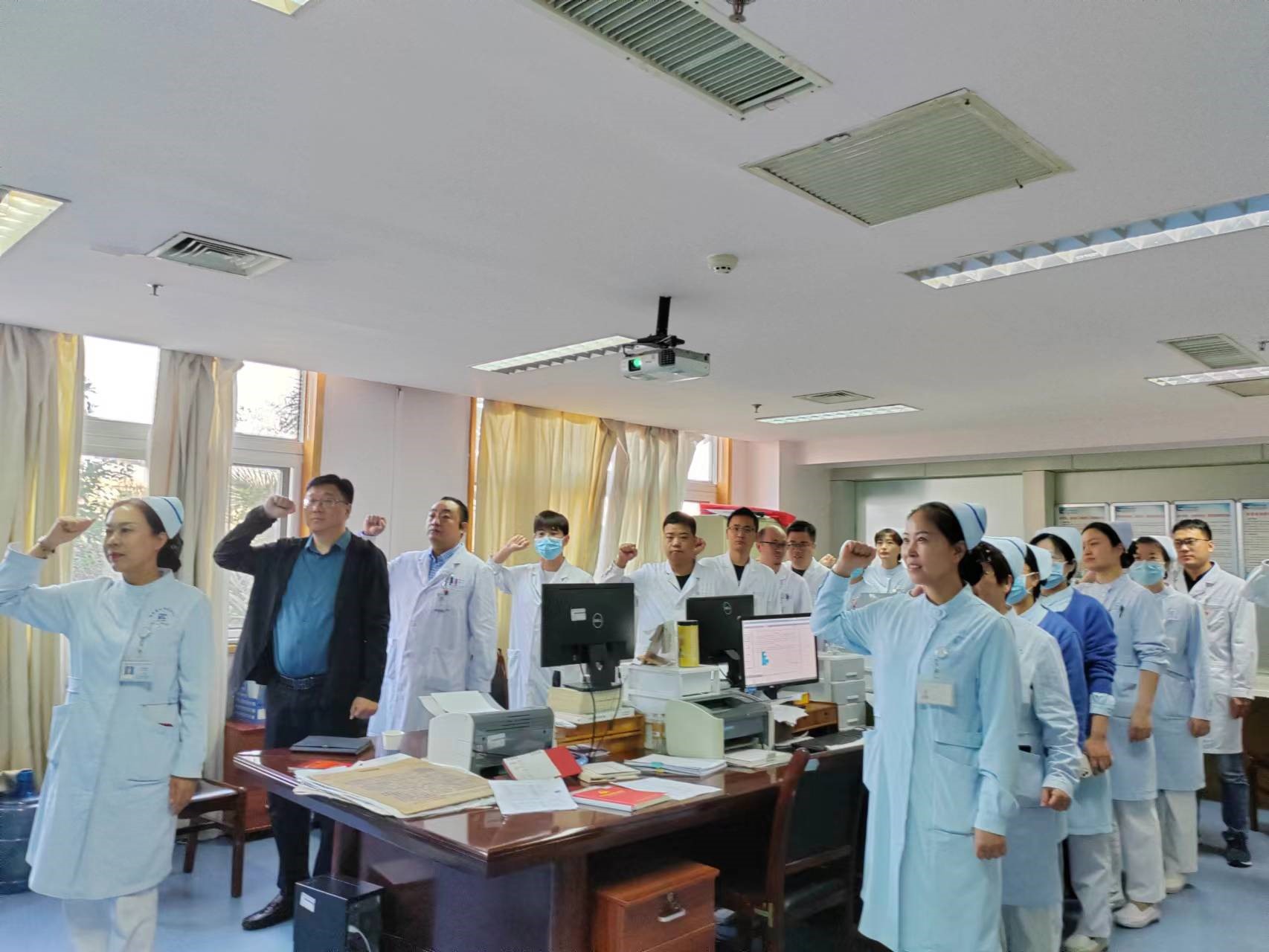 2023年10月31日上午临床第二党总支三支部全体党员在住院部二号楼4楼医生办公室召开主题党日及组织生活会,会议由党支部副书记郭晓辉主持。本次会议由郭晓辉副书记结合自己在省委党校的学习,把自己的感想向各位党员进行了汇报,并把学习内容与大家进行了交流分享。