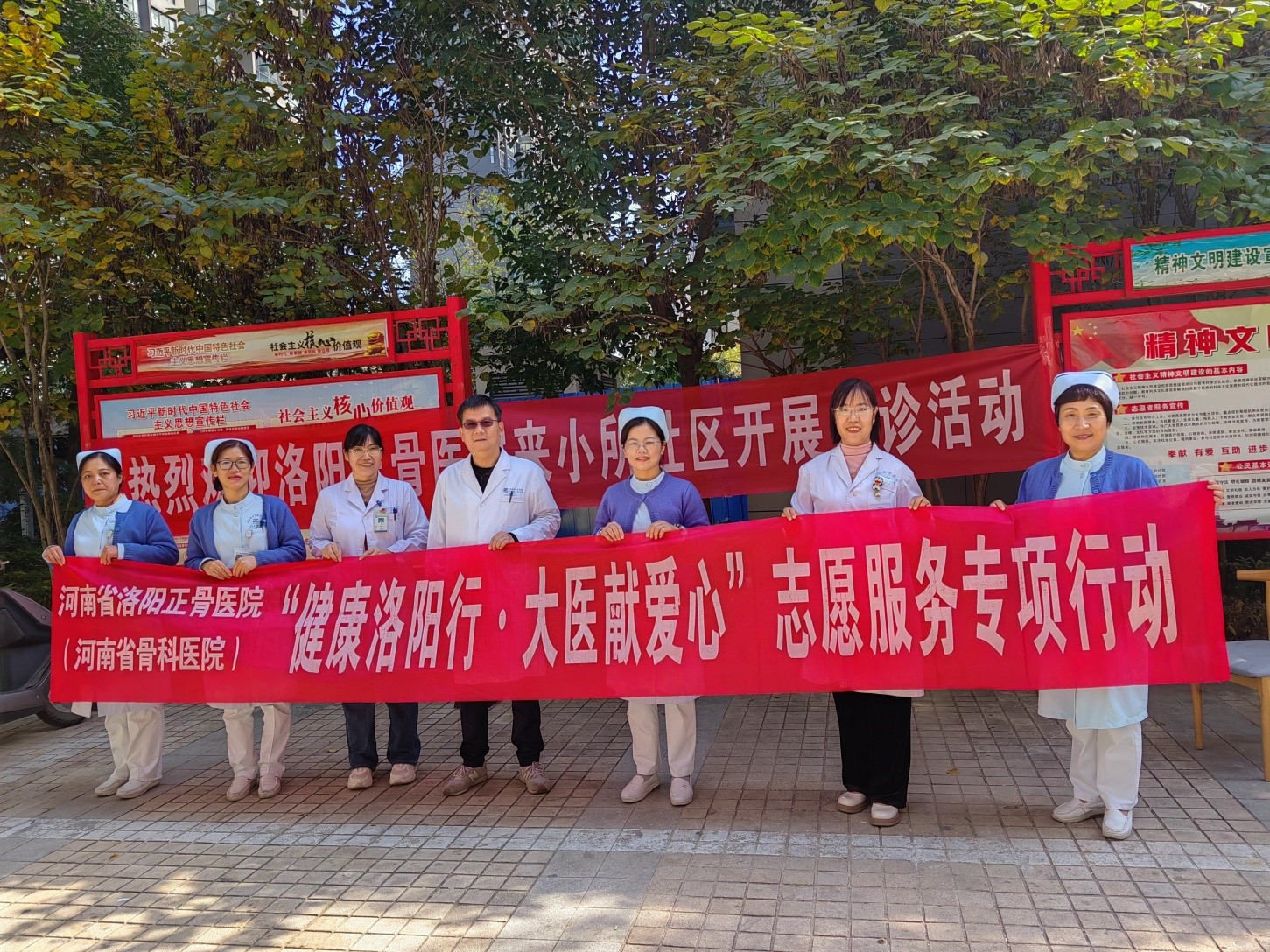 秋高气爽,丹桂飘香,2023年10月31日上午,由我院开元门诊部护士长白淑红牵头,我院颈肩腰腿痛(推拿)诊疗中心廖继东主诊组长、毛晓艳主治医师、罗姣主治医师、主管护师苗金丽、张媛、孙姣姣参与组成的医护团队前往涧西区小所佳苑社区开展了“健康洛阳行?大医献爱心”义诊及科普宣教活动。
