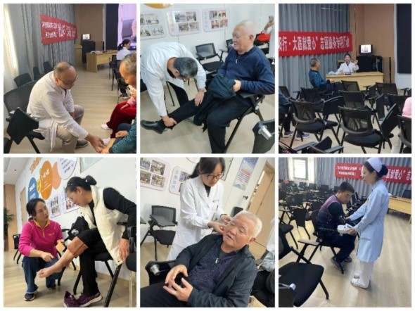 科普讲座结束后,专家们开展现场义诊活动。张延杰副主任医师和李启义医师耐心地为患者查看片子及查体,并一一进行答疑解惑。程月起护士长为患者详细指导老年人日常生活中的注意事项,赵建梅护士长热心地和患者交谈着,为他们贴上医院自制的膏药,并耐心地嘱咐贴膏药的注意事项,武文娟护士在为失眠患者及高血压患者进行耳穴贴压,张亚真护士和高盈辉护士在为患者监测血压,现场气氛热烈。