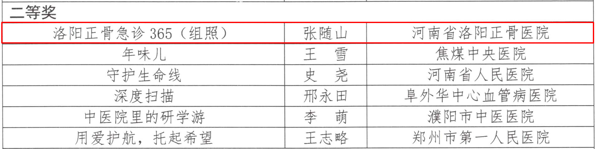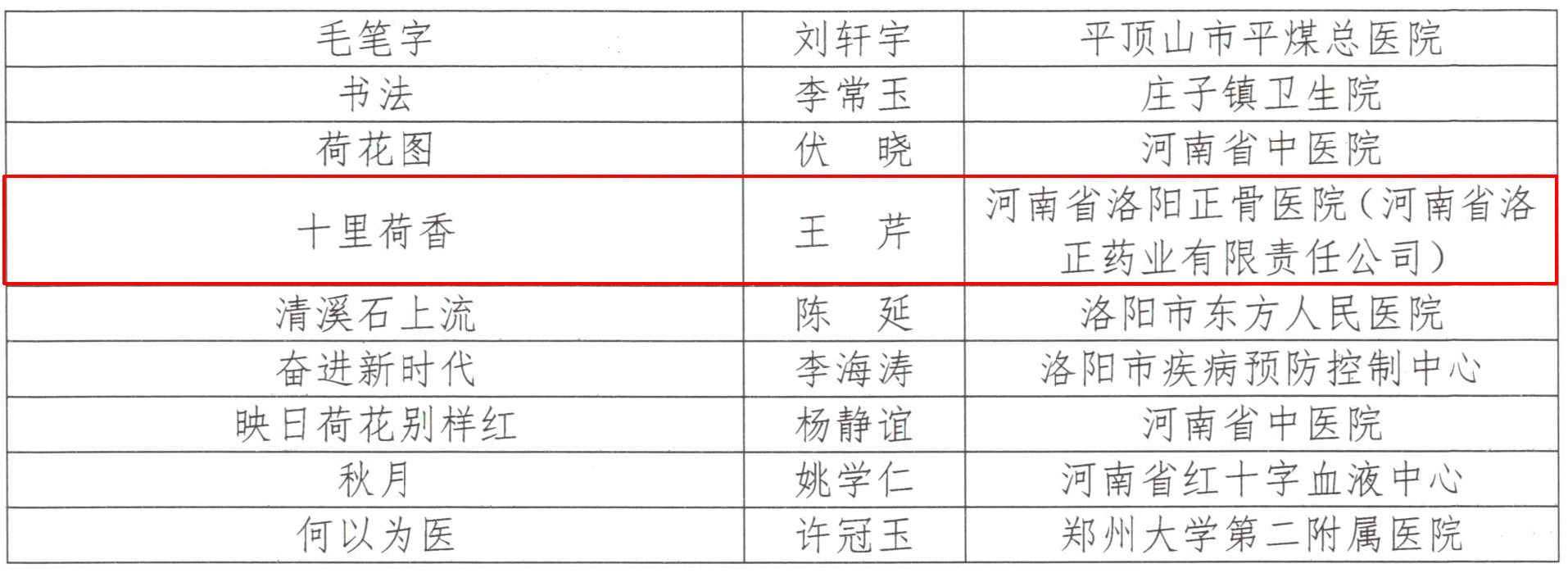 本次活动作品评选分为书画类、摄影类、文学类、视频类,征集各类作品共计1098件。经过三轮评审,我院张随山同志作品《洛阳正骨急诊365(组照)》荣获摄影类二等奖,产业单位王芹同志作品《十里荷香》荣获书画类优秀奖,吕晓波同志作品《那位她》荣获文学类优秀奖。