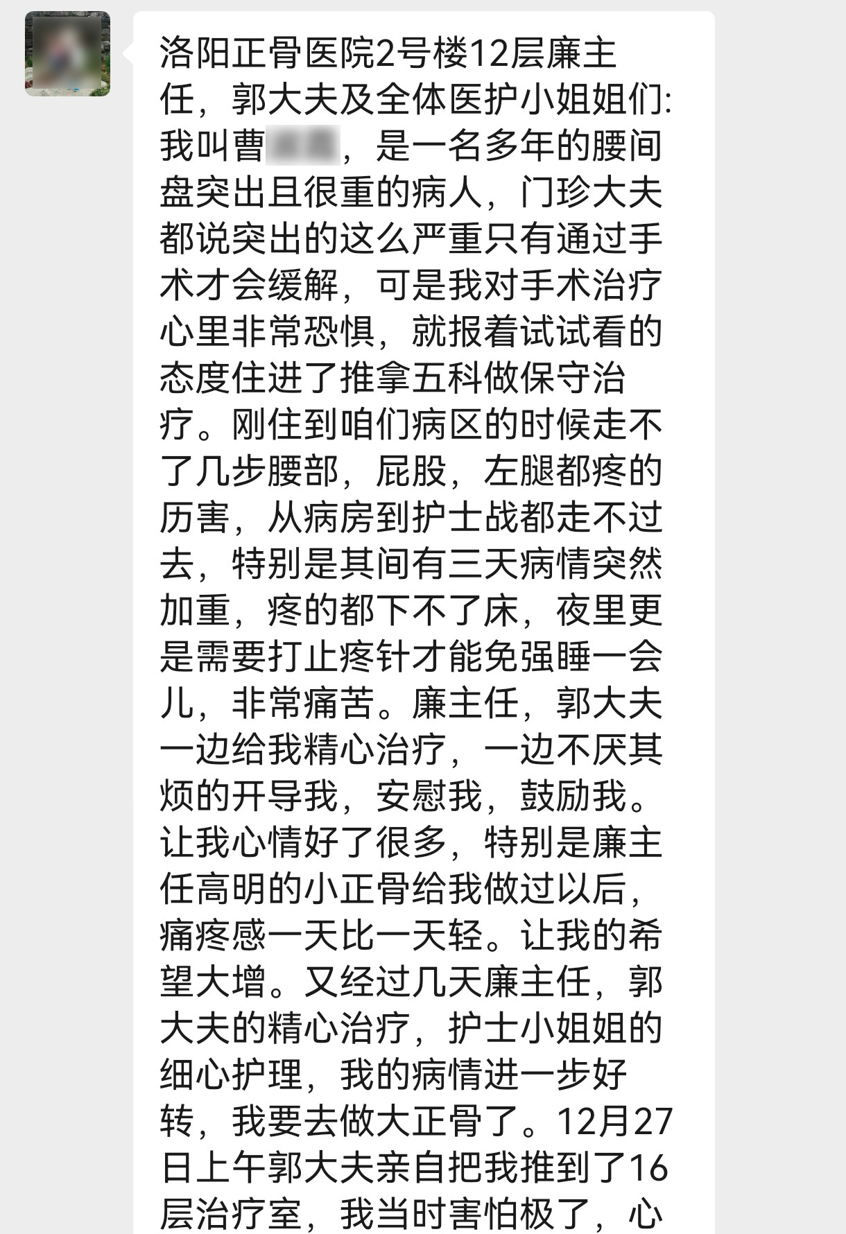 复位后卧床的第二天曹女士就感觉腿不疼了,麻木感也消失了。她惊奇地和护士说到“太神奇了,我都不敢相信,我刚才拧了一下我的左腿,麻木感消失了。”伴随曹女士十多年的腰椎间盘突出,就像她心里时刻悬着的一块石头,终于落地了。12月30日这一天,曹女士出院了,回家后仍是满怀感激之情,正值新年伊始,才有了这篇长达千字的感谢信。