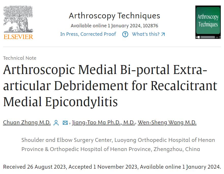 近日,我院郑州院区肩肘外二科张川团队原创文章《Arthroscopic Medial Bi-portal Extra-articular Debridement for Recalcitrant Medial Epicondylitis(关节镜下内侧双入路关节外清理治疗顽固性肱骨内上髁炎)》于2024年1月在《Arthroscopy Techniques(关节镜技术)》杂志在线发表。该杂志为Elsevier(爱思唯尔)出版集团旗下SCI收录期刊,关节镜技术领域权威杂志,运动医学关节镜方面顶级期刊《Arthroscopy(关节镜)》的兄弟期刊,以报道全球关节镜领域创新性技术内容为主。