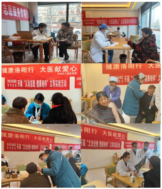 2024年1月25日,我院颈肩腰腿痛三科、风湿病三科和运动医学科医疗护理团队组成义诊医疗队走进伊滨区诸葛镇司马社区党群服务中心,开展“健康洛阳行?大医献爱心”志愿服务专项行动,为社区群众提供义诊服务。