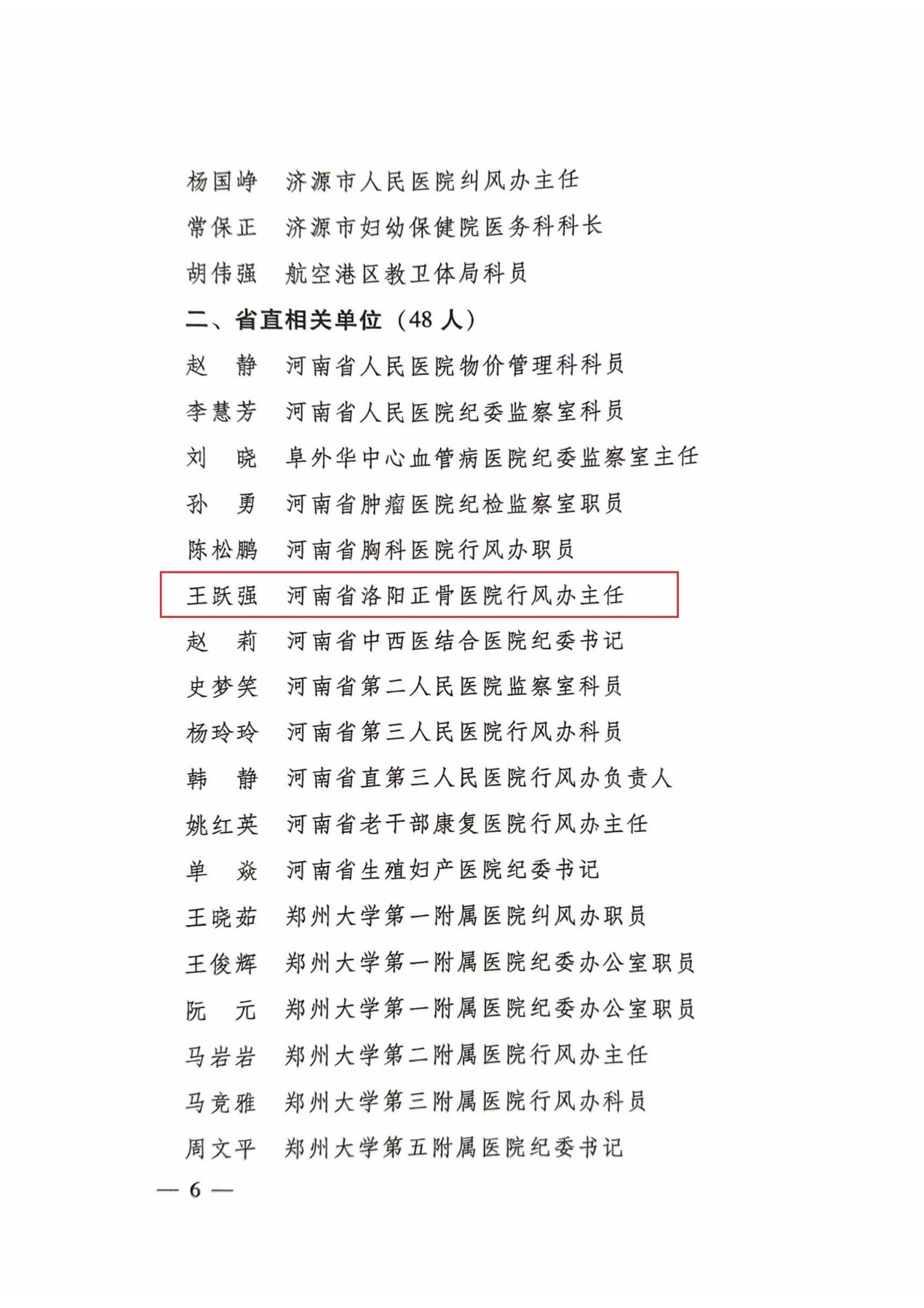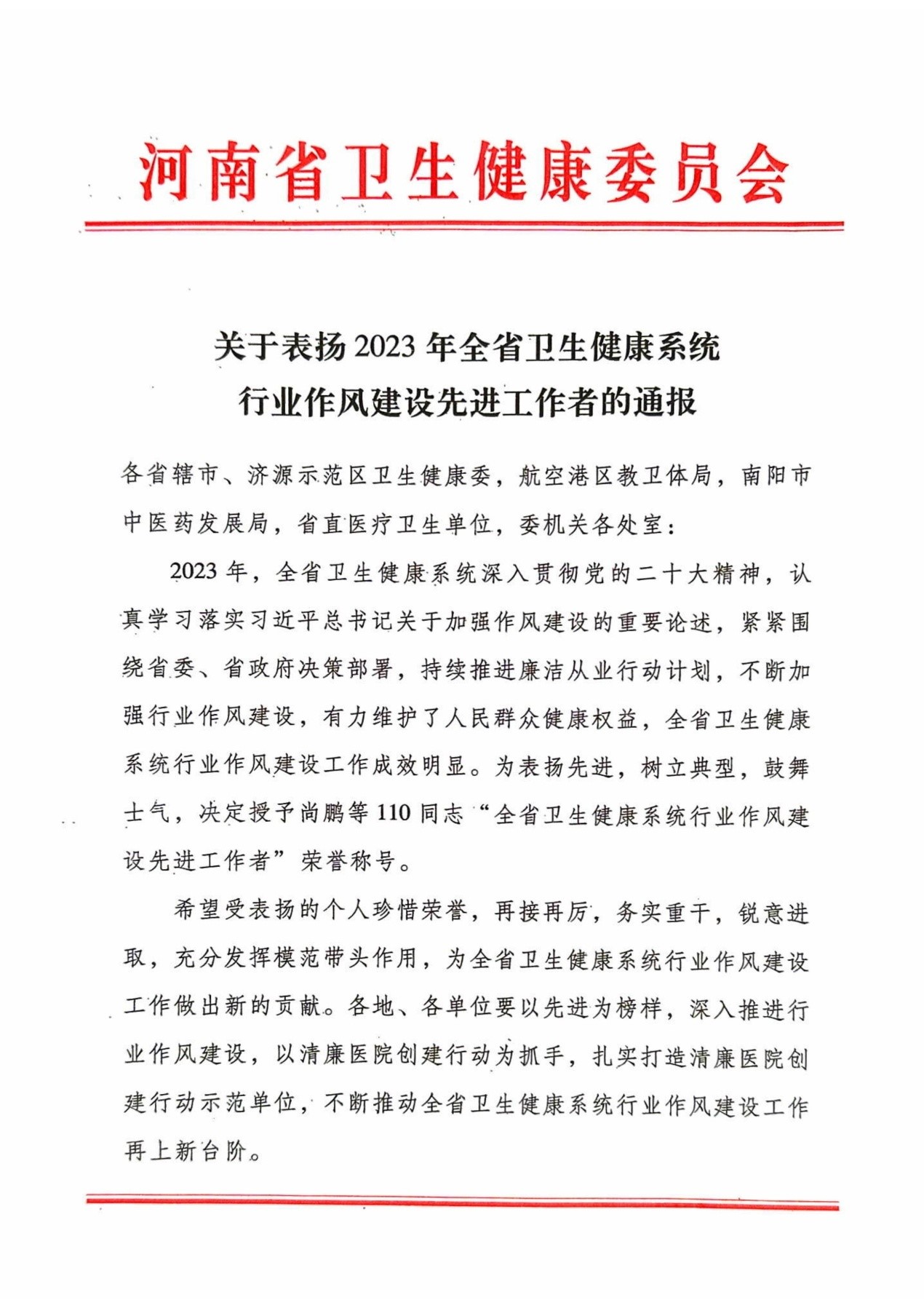 2023年,全省卫生健康系统深入贯彻党的二十大精神,认真学习落实习近平总书记关于加强作风建设的重要论述,持续推进廉洁从业行动计划,不断及其行业作风建设,卫生健康系统行业作风建设工作成效明显。为表扬先进,树立典型,鼓舞士气,共授予全省110名同志“全省卫生健康系统行业作风建设先进工作者”荣誉称号,我院行风办主任王跃强同志光荣入选。