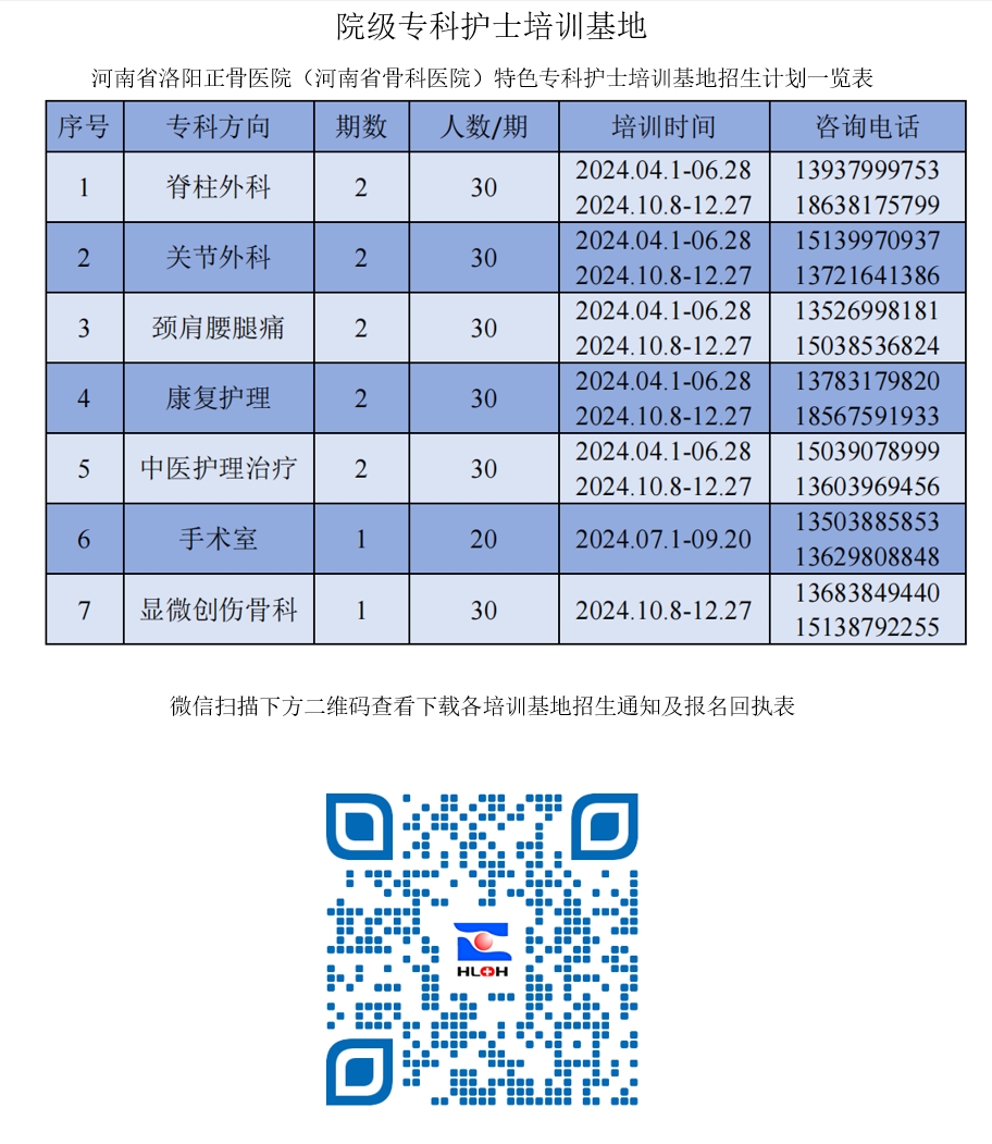 为进一步加强专科护士队伍建设,积极响应《全国护理事业发展规划(2021-2025年)》(国卫医发〔2022〕15号)、《进一步改善护理服务行动计划(2023—2025年)》(国卫医政发〔2023〕16号)、《河南省护理事业发展规划(2021-2025年)》(豫卫医﹝2022﹞40号)等各级文件精神,不断提高临床骨科护理及中医护理专业技术水平,满足患者多样化临床护理服务需求,助推专科护理高质量发展,提高人民群众健康水平,助力健康中国建设。河南省洛阳正骨医院(河南省骨科医院)启动2024年专科护士培训基地招生工作。具体如下: