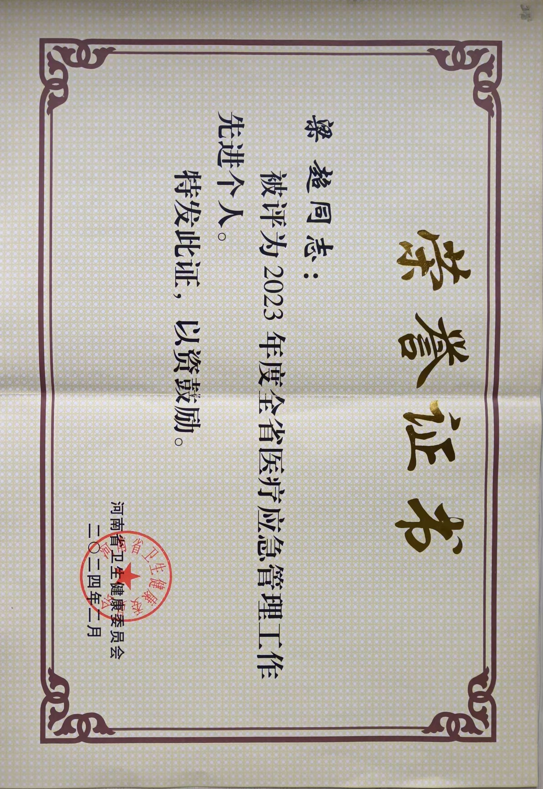 医疗应急工作是提升医疗安全保障能力的坚强保障,2023年,我院认真扎实做好医疗应急工作,出色完成了突发事件医疗救治和紧急救援工作以及上级交办的其他任务。根据我院医疗应急工作完成情况,为鼓励先进,树立典型,我院梁超同志被河南省卫生健康委员会评为“2023年度全省医疗应急管理工作先进个人”。