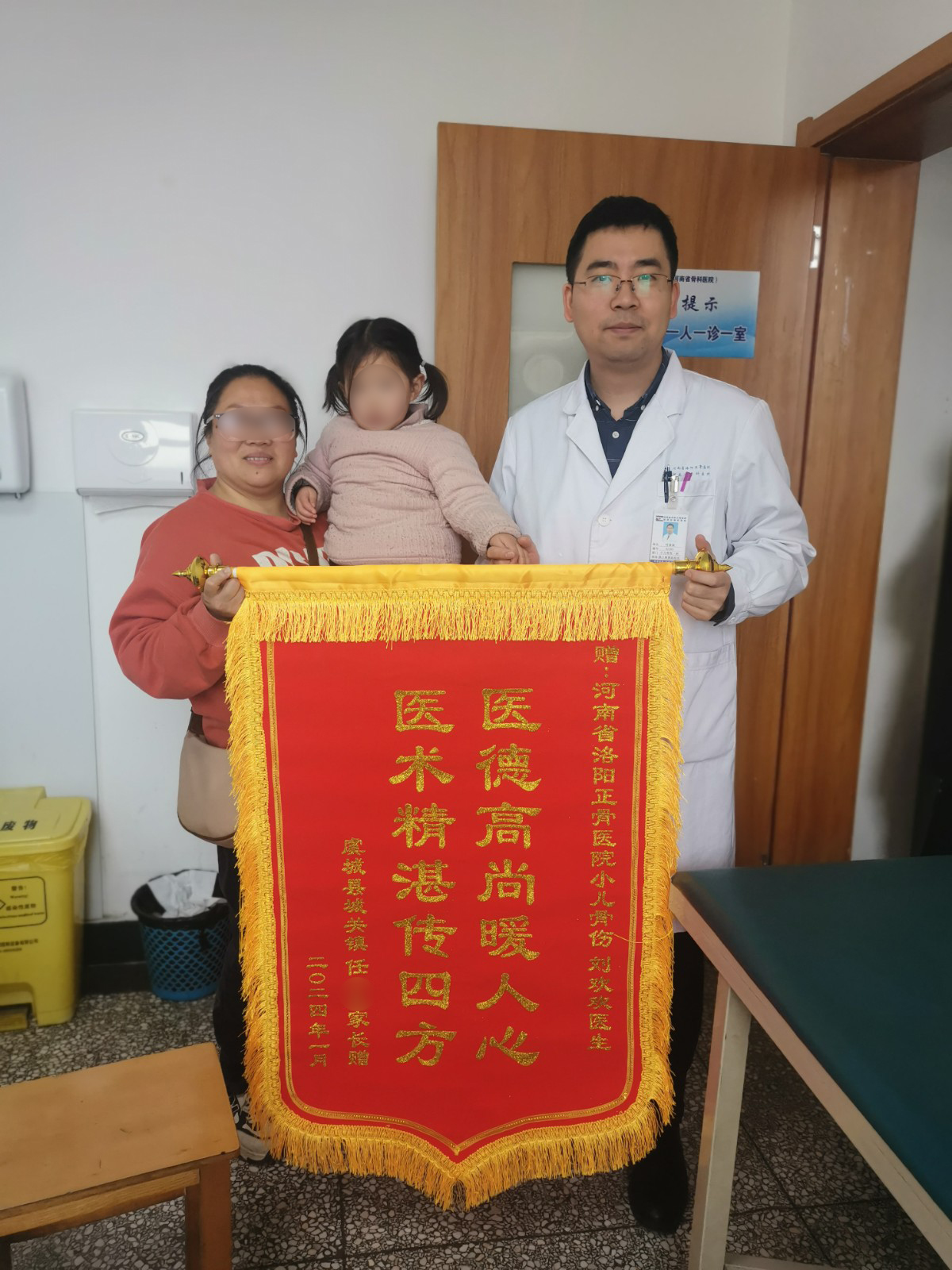 主诊组长刘欢欢带领团队给孩子做了完善细致的术前检查,并对畸形情况进行了评估,制定了严密的手术计划,决定开展行肱骨髁上截骨矫形术,手术后效果非常好,肘内翻情况得到显著改善。手术后3个月,家长带着孩子来复查,肘关节屈曲活动正常,家长高兴的说:“真是太感谢刘大夫了,不仅医术精湛,而且耐心、细心!”一面锦旗,是一份认可,更是责任与激励!