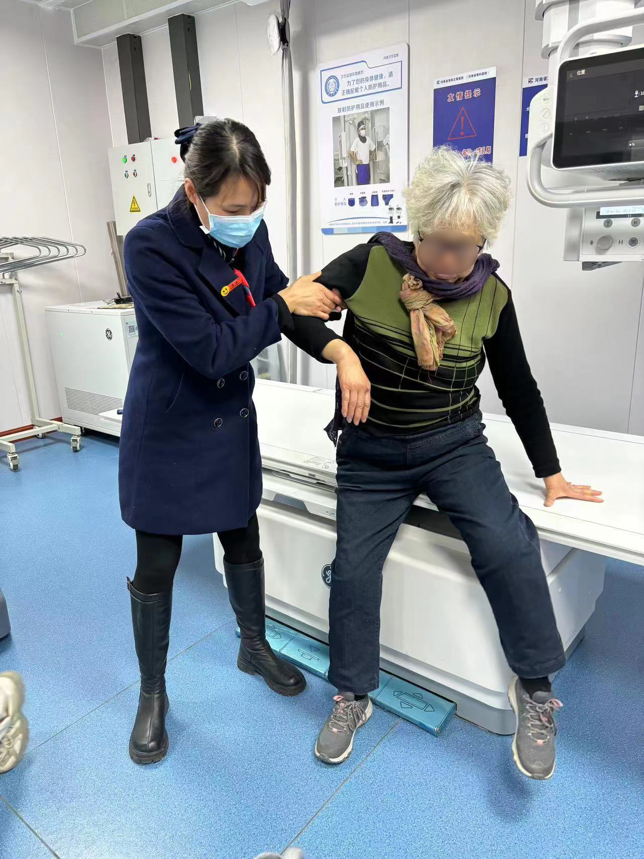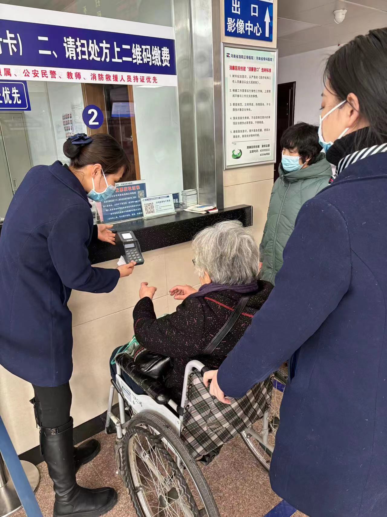 “阿姨,您哪里不舒服啊?是一个人来看病的吗?”在洛阳东花坛院区门诊导医台,工作人员亲切的询问一位前来就医的患者。“我就一个女儿,在国外,就自己打车来医院了。”经过询问,工作人员了解到患者赵阿姨已经75岁,女儿在国外,亲属也不在身边,不小心摔了一跤后,感觉浑身都疼,手腕更是高高肿起,不能活动,只好孤身一人来到医院看病。了解情况后,门诊工作人员立即决定,由一位导医陪同赵阿姨看病,租借轮椅、挂号、问诊、拍X光、缴费,都由工作人员全程陪同办理,经过医生检查,赵阿姨手腕骨折,并为其安装了支具,建议回家休养。