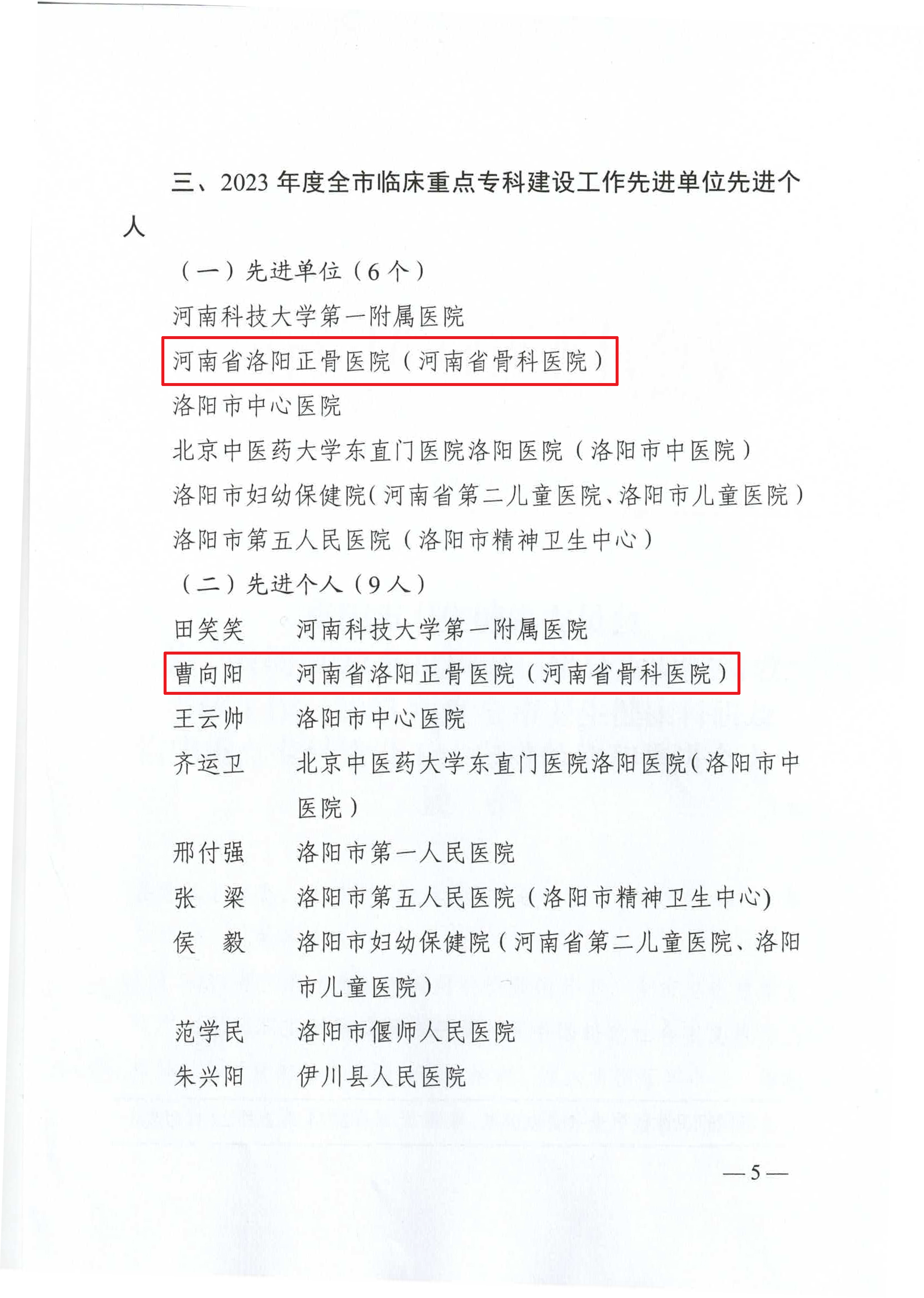 其中,我院荣获2023年度全市临床重点专科建设工作先进单位称号,我院副院长曹向阳荣获2023年度全市临床重点专科建设工作先进个人称号。