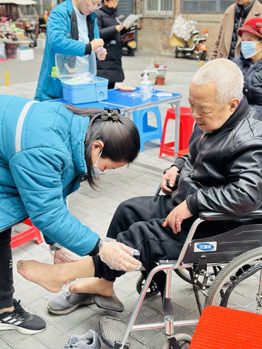 活动期间,一名坐轮椅的患者来到现场,向义诊科普团队诉说了多年下肢受限、无法远距离行走的情况。程真真主任了解情况后,现场为患者手法按摩,指导功能锻炼,并提供了康复方案建议。患者和家属激动地拉着程主任说,感谢专家们能够真正将健康义诊送到“家门口”,并表示安排好时间到医院进行全面诊治。